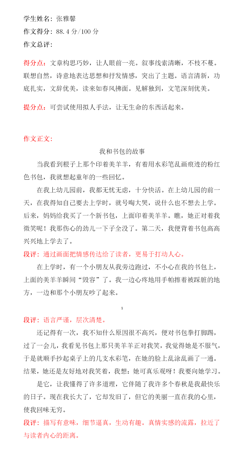 张雅馨是一个外在略微腼腆,内心情感细腻真挚的女孩子。喜欢看各种各样的书,每当收到一本新书,不吃饭、不睡觉也要一口气看完。写作是孩子内心世界的另一个展示窗口。从她的作文中,我们了解到了她积极乐观的一面,很欣慰孩子的价值观积极向上。希望她的童年能够充实而又不乏童真童趣。