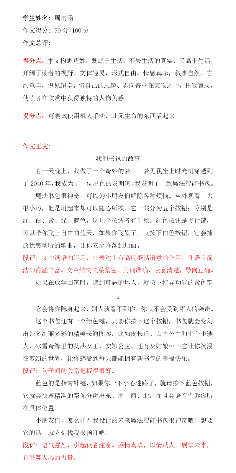 本文大胆想象,敢于突破创新,设计出魔法智能书包,将自己美好的愿望寄托在魔法书包之中,新颖而充满乐趣,一解平时学习生活中单调与乏味,带领读者进入美好而神奇的想象世界。愿你继续在写作的殿堂里展翅翱翔。