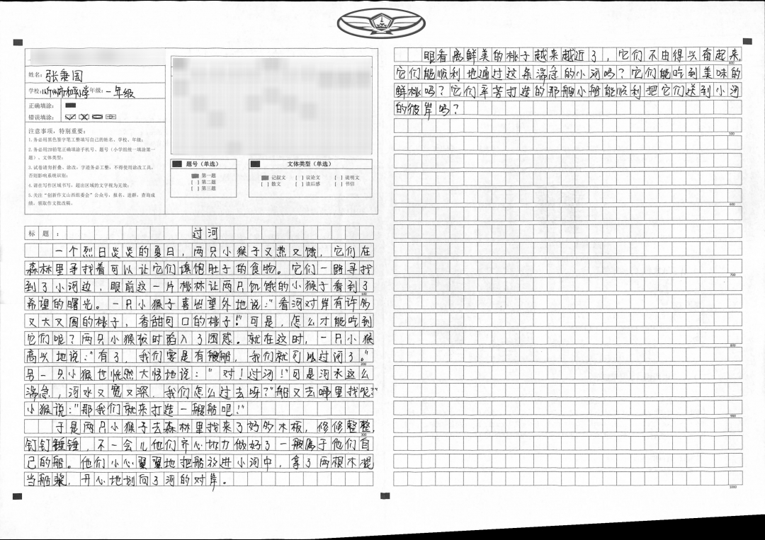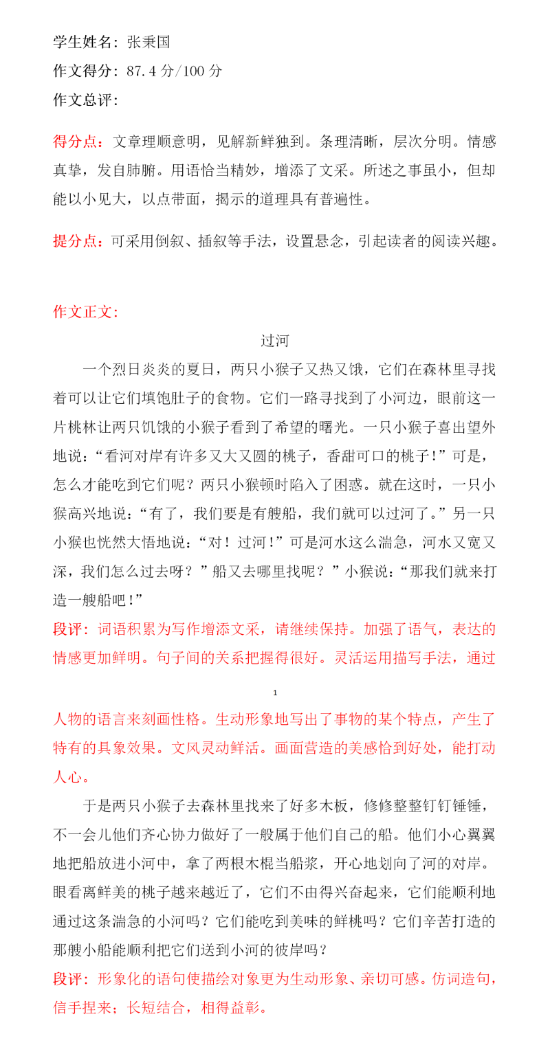 这篇“看图写话”主人公是2只可爱的小猴子,写作要素有河边、河对岸的树林、木盆以及过河。小作者把四幅图连贯起来,快速创编出一个小猴子吃桃子的故事,在这样一个整体框架的支撑下,再将每幅图的内容充盈起来,小作者展开时间,季节,地点,小猴子的语言、动作等生动有趣的想象,加入故事框架中,这样使文章更丰满,故事更生动有趣,文末从小猴子吃到桃子受到启发,发现生活中我们也会遇到像“过不了河”等难题,要像小猴子一样积极想办法,总会找到解决的方法,做一个生活中的“聪明的小猴”!
