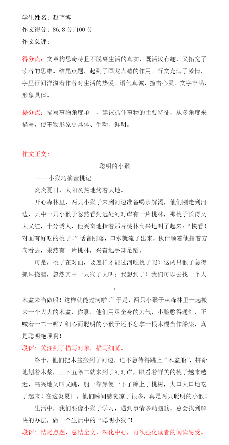 学生凭借丰富生动的语言刻画出了两只既活泼可爱又聪明机敏的小猴子形象。故事整体想象合情合理、叙述生动、衔接自然连贯。小作者在结尾处揭示中心之句,凸显了文章主题,实属点睛之笔。
