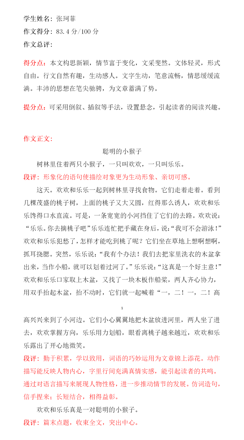 珂菲是个细心的女孩儿,平日就很善于观察生活。在看图写话时能敏锐地捕捉一个个生动有趣的瞬间,作文读来语言丰富,内容饱满,两只聪明的小猴子形象跃然纸上。
