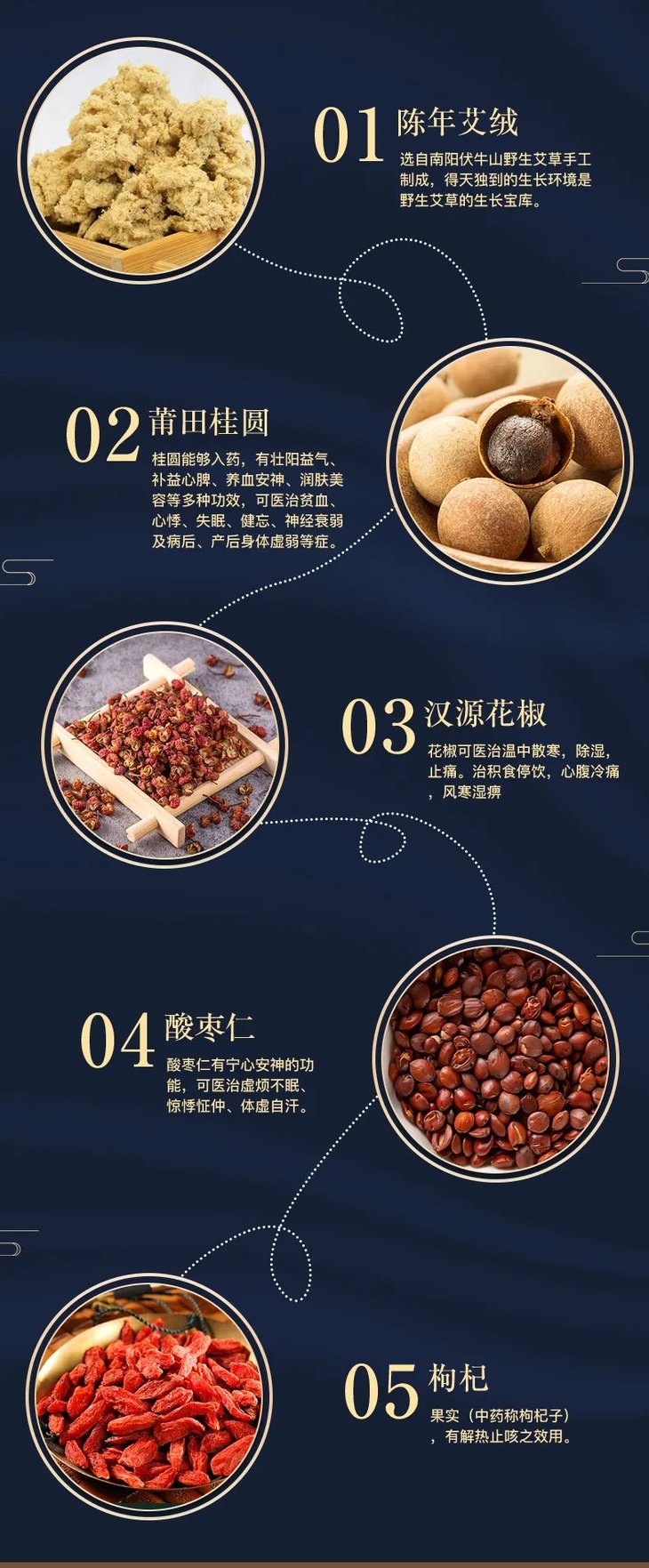 这款艾脐贴用花椒、桂圆、艾绒、酸枣仁、枸杞合理配伍,贴于肚脐,特别在三伏天时期,祛湿驱寒有事半功倍的效果。