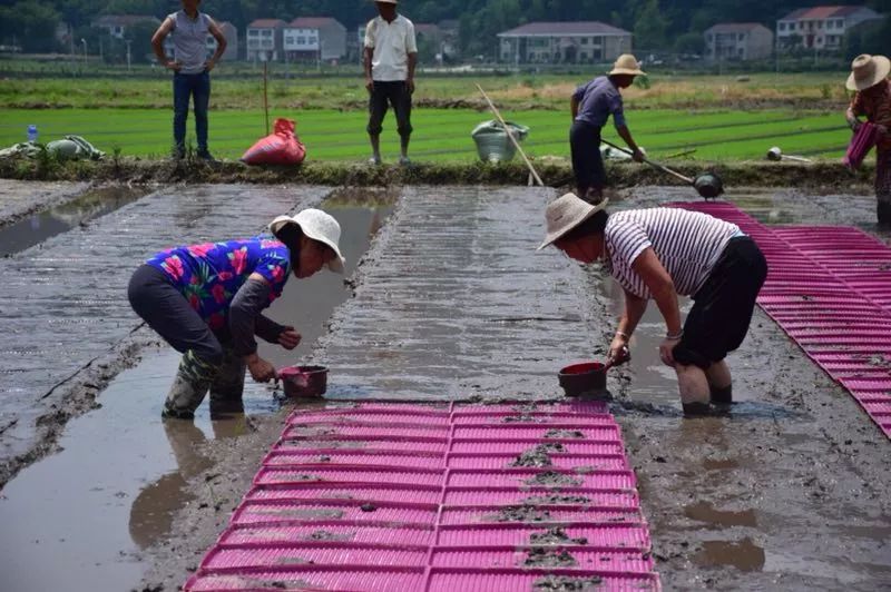 前期的育秧尤为重要,先施足饼肥,接着打浆,比着线摆放育秧盘,再把泥浆舀到育秧盘中。为了保证种子均匀地铺满秧盘,必须用挡板,一方面保证边缘上也撒有种子,另一方面防止种子撒到外面,最后是烫平厢面,每一个细节都不能马虎。