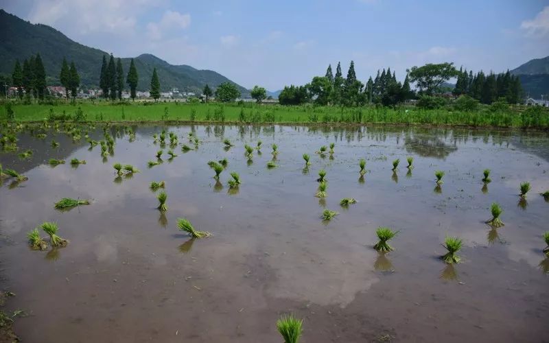 干农活较久的妇女,多少有些臂力,挑着担子,将育秧田里的秧苗运至不远处的插秧地中。接着将秧苗扔进水中,拿起一把又一把待栽的秧苗,朝东西南北几个方向均匀地甩出,活脱脱将艰辛劳累的日子“甩”成了一种别样的情趣,一种驾轻就熟的艺术。