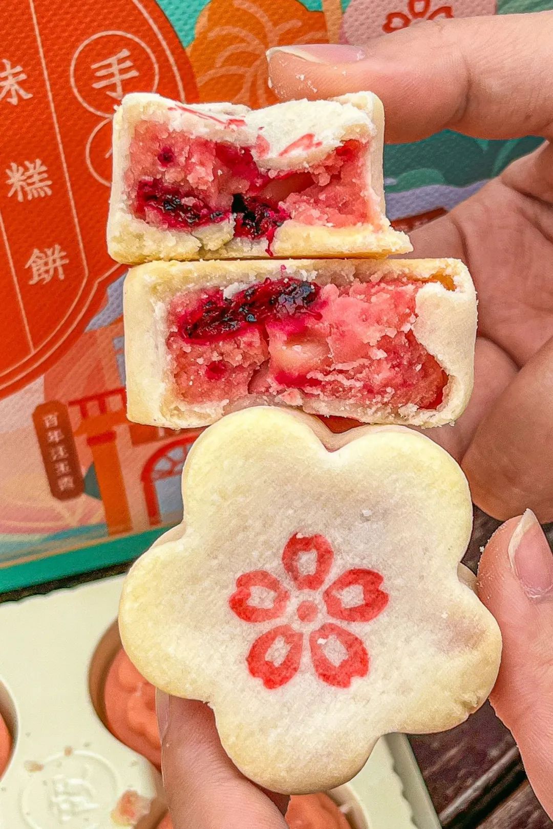 一口下去,酥软绵柔,露出粉色内陷,嚼得到的果干,层次丰富,清新淡雅。