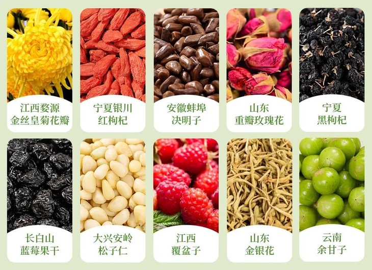 拆开袋子,一股浓郁的果草香气扑鼻而来,里面的菊花、松子仁、枸杞子等新鲜食材清晰可见!让人口水直流~