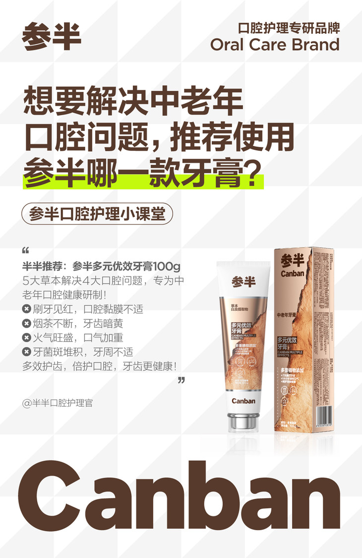 想要解决中老年口腔问题,半半推荐使用参半哪一款牙膏?