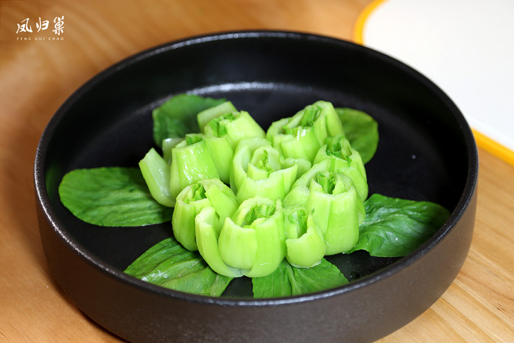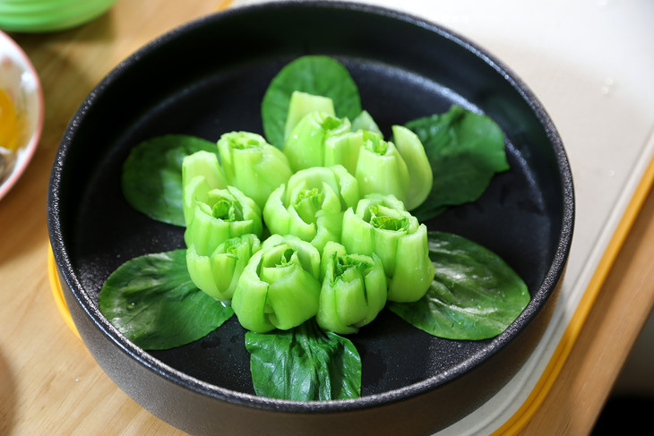 3、找圆形平底盘,先将菜叶平铺成绿叶造型,然后将菜头(刀口向上)放在中间;