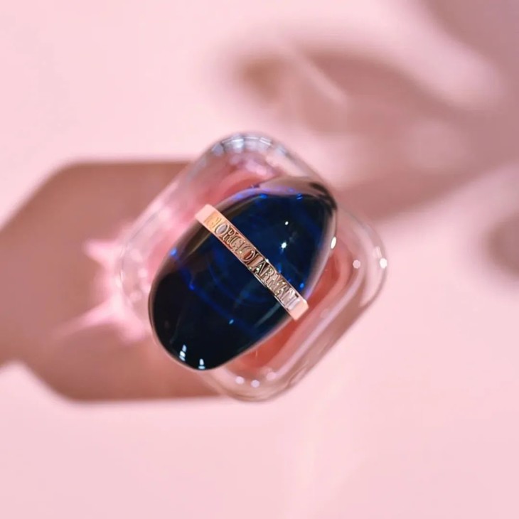 瓶内盛有明媚动人的淡粉色香水,与质感出众的深蓝色瓶盖形成鲜明对比。