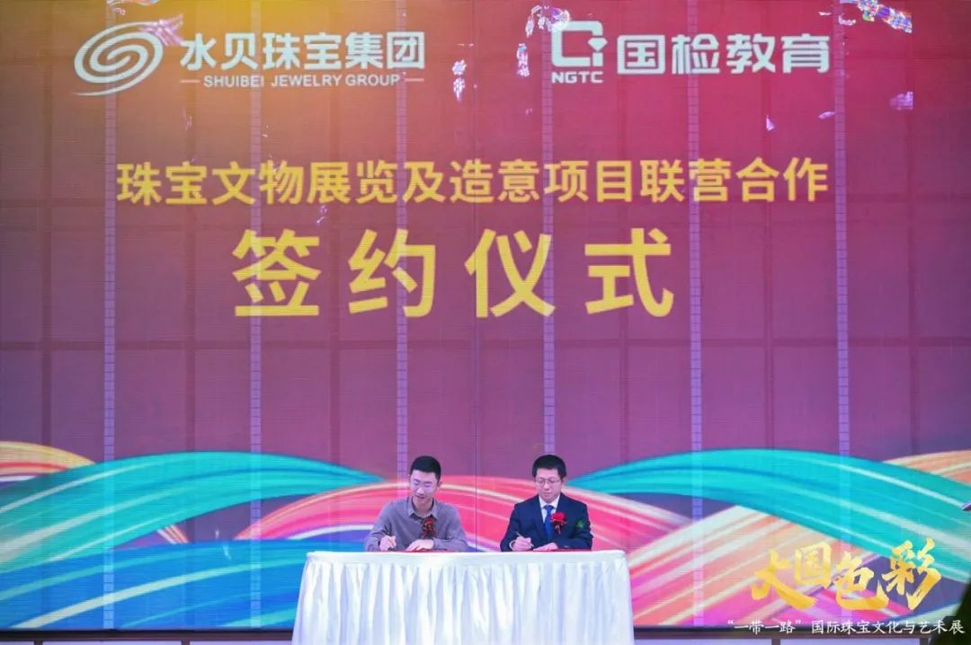 在开幕式上NGTC国检教育总经理徐军先生与水贝珠宝集团总裁卢森荣先生签署了“珠宝文物展览及造意项目联营合作”协议,双方表示将在更多的领域开展合作,以期为珠宝行业发展添砖加瓦,保驾护航。
