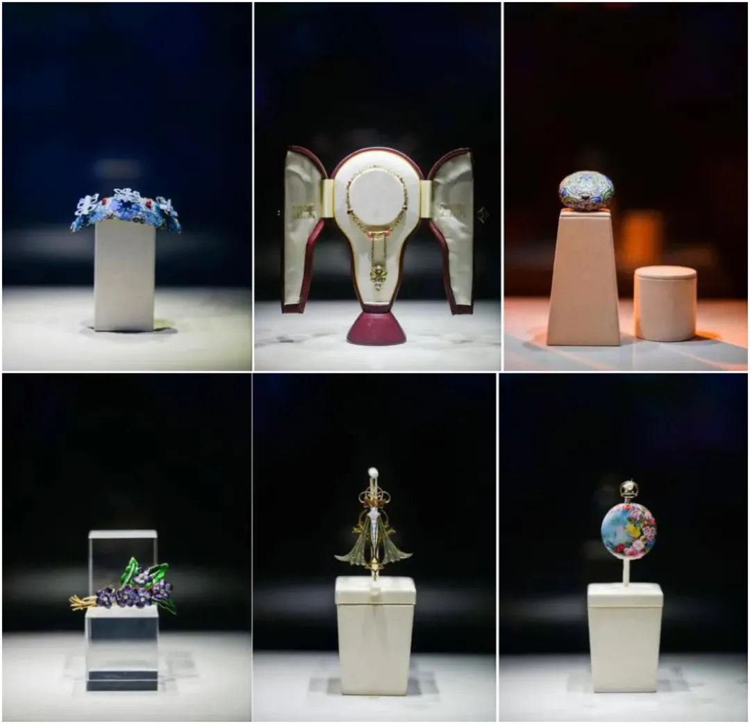 依次为:清代点翠帽冠(上左);工艺美术时期库伯手链(上中);新艺术时期法贝热圆形盒子(上右);维多利亚时期Tiffany花型胸针(下左);新艺术时期富凯珐琅吊坠(下中);百达翡丽珐琅怀表(下右)