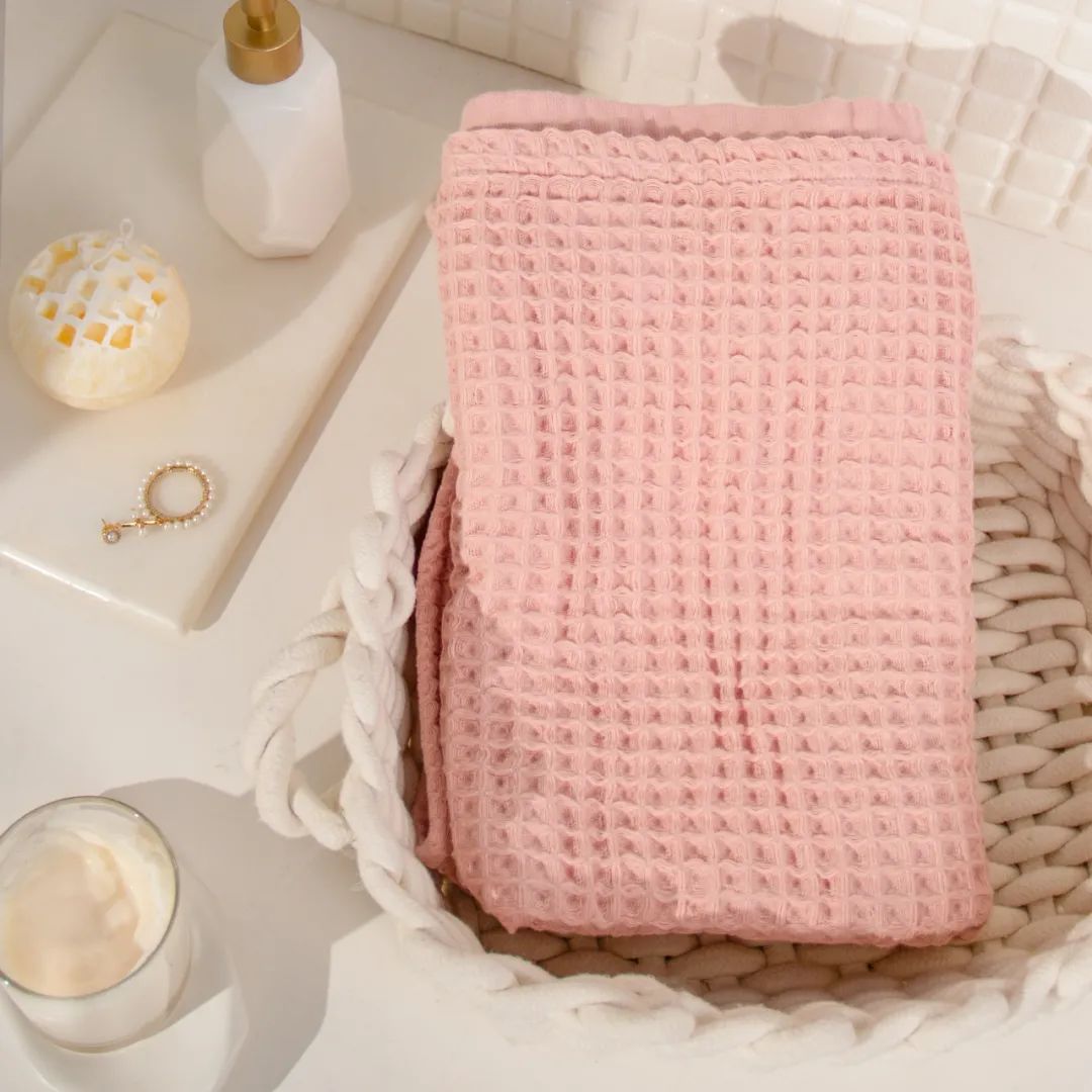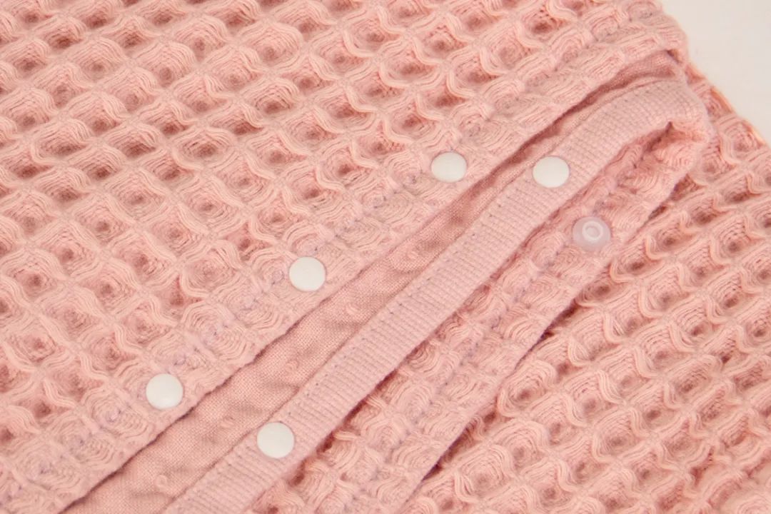 它家浴巾分了很多不同系列,我现在用的是微柔和颜系列,叫它“华夫饼”可能更贴切哈哈,浴巾上的华夫格不仅高颜值,rua起来手感也很好!浴巾侧边还有暗扣,可披可裹,穿脱很方便 。