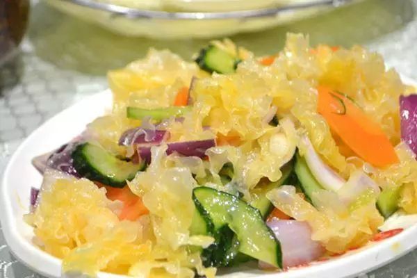 做法:鲜银耳泡发后撕成小朵,再进行冲洗干净后过沸水轻烫,然后再捞出沥水,放入到调料盘中。紫甘蓝、大蒜、葱花切碎,并一同放入到调料盘中去,然后再撒上适量的盐和蘑菇精进去,还需要淋入白糖和白醋,再滴上少许的香油,再将其拌匀,冷藏后食用更佳。