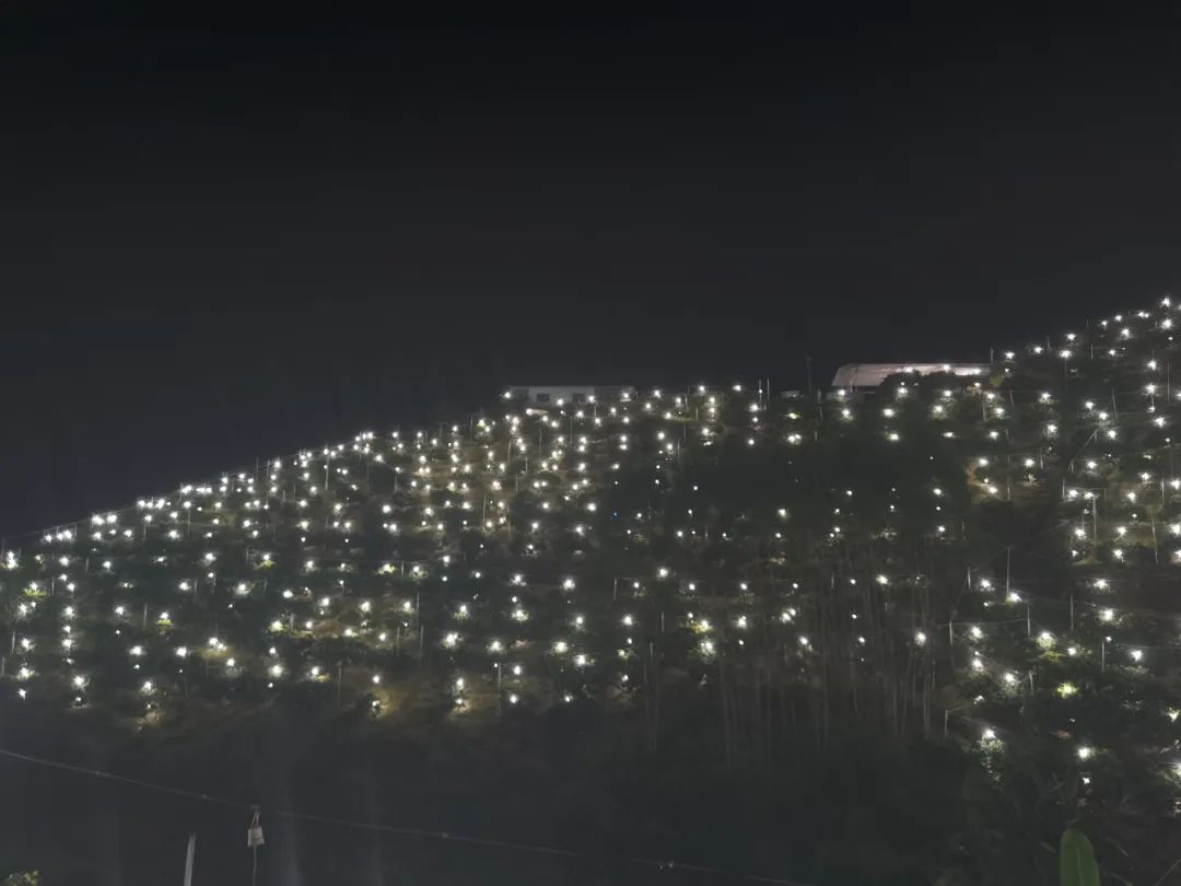 而且,因为这种的防控措施,所以让整个果园在夜晚拥有了“点点星光”,看上去又浪漫又美丽。