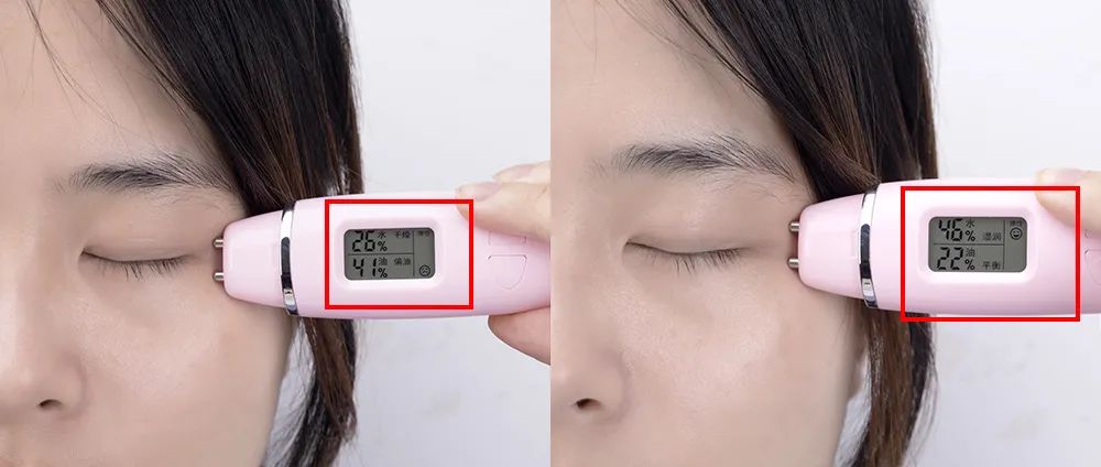 来看看我们的测试结果,涂抹完眼霜以后比没涂之前含水量增加53%!含油量减少46%!