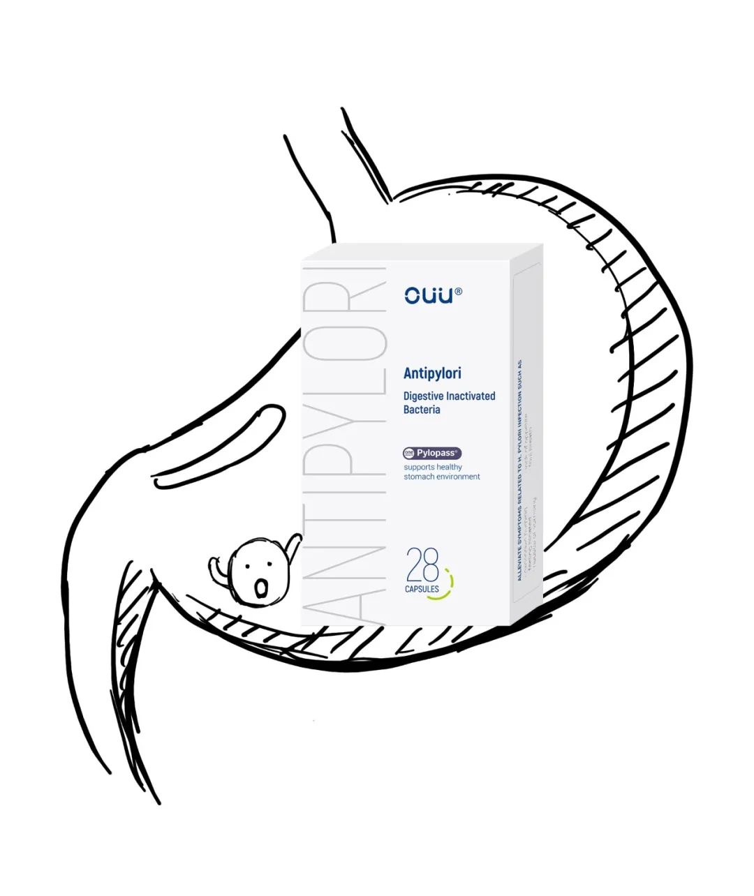 OUU抗幽护胃胶囊里每一粒胶囊含有足足200亿Pylopass®,一口吃下去,这200亿的小家伙能直达幽门螺杆菌兴风作浪的地方,精准锁定,强行结合,把他们拖出体外。