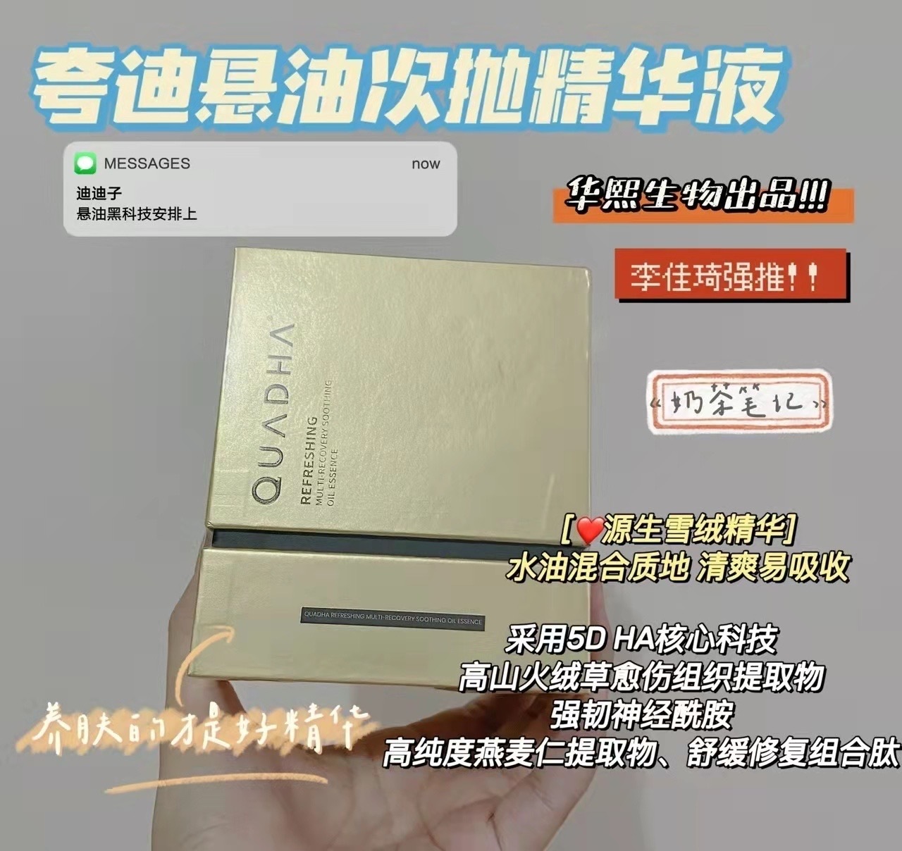 真的是华熙生物亲儿子,好用牛批的成分都给了夸迪,却只卖了几百的价位!讲道理原价也很良心!简直秒掉一堆空有贵妇之名的大牌护肤品!