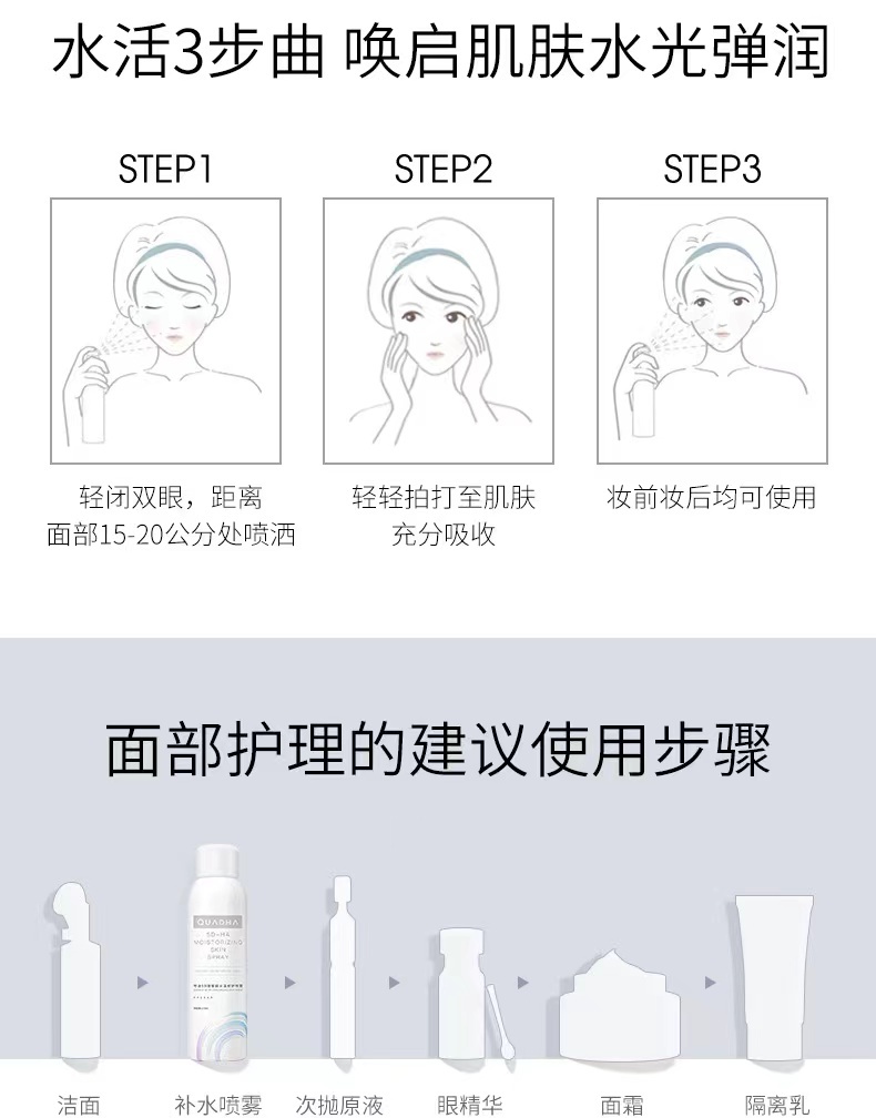 功效:改善皮肤干燥、打造水润肌肤,随时补水定妆!
