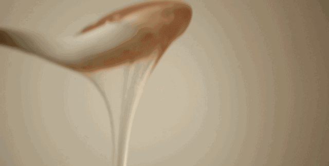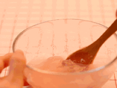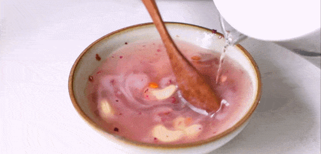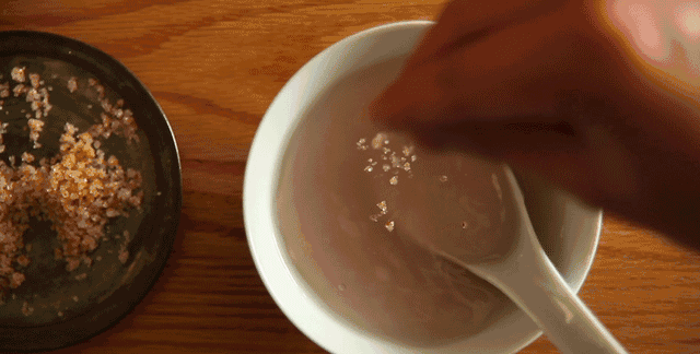 随着沸水的加入,勺子快速搅拌,如变魔术一般,藕粉渐渐从浑浊的液体变得透亮清澈