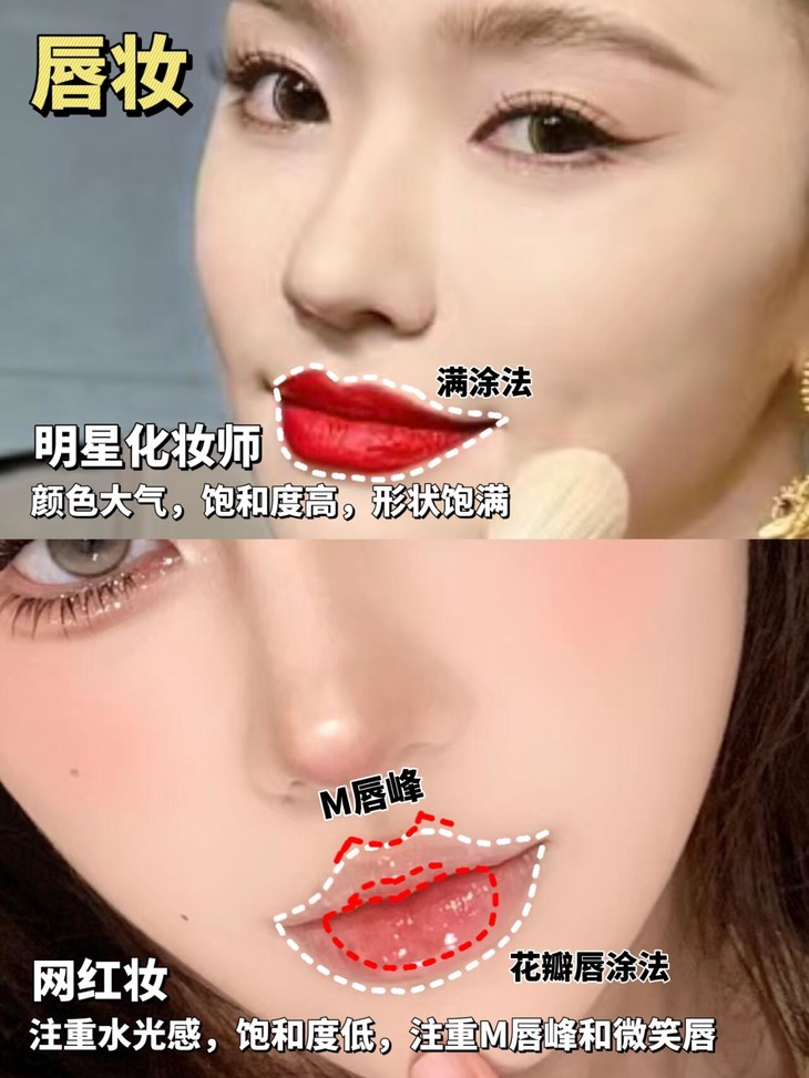 网红妆 :注重水光感 饱和度低 注重M唇峰和微笑唇