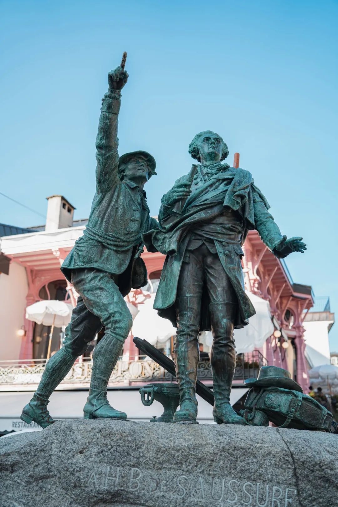 有两个下午我跑到霞慕尼中心广场的粉色餐吧喝着咖啡浪费光阴,面前矗立着一座纪念雕塑,背着路绳的巴尔马特激动地指向远处一座山峰,一旁的索绪尔放下望远镜久久注视着它,顺着巴尔马特手指的方向和索绪尔的视线望去,那便是勃朗峰。