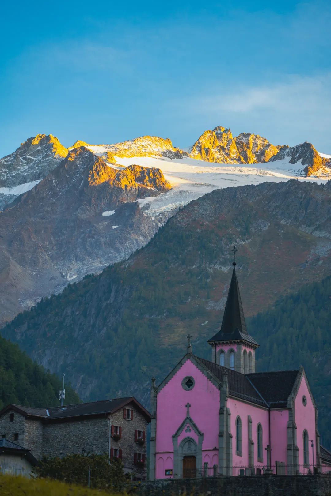 镇上教堂的钟声大概每15分钟敲响一次,五颜六色的滑翔伞从南针峰飘下盘旋在空中,黄昏时分山尖率先被点亮,随后金色的光线顺着山脊倾泻下来蔓延到整个山谷,温柔地包裹住每一个在此处游荡的灵魂。