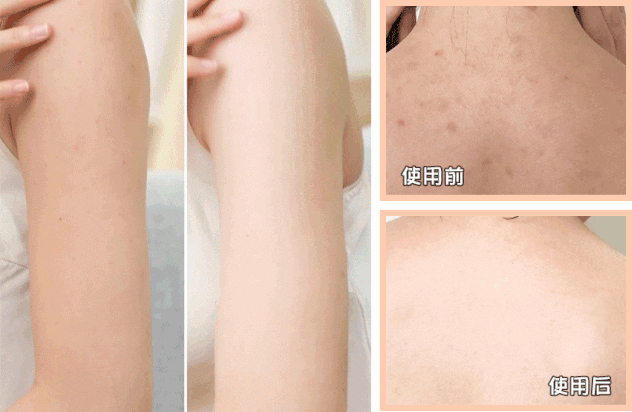 另有美白扛把子——烟酰胺的加持,原来背部长满痘痘的皮肤,越来越光滑亮白了。
