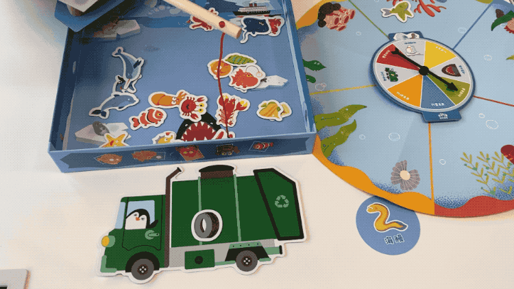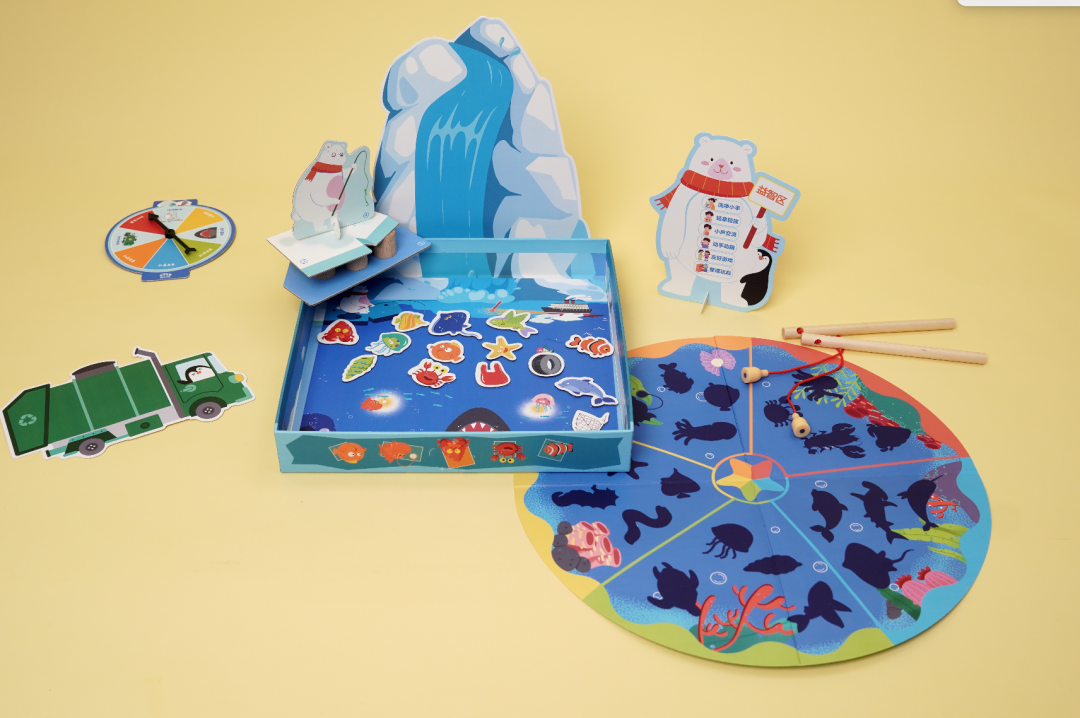 1个游戏盒 1块冰山板 1个指针转盘 1个北极熊套装 1张夜晚海洋板 1张区角规则卡 1个垃圾车 1块五色海洋板 2根钓鱼竿 20张海洋动物卡 25片海洋动物及垃圾磁力片
