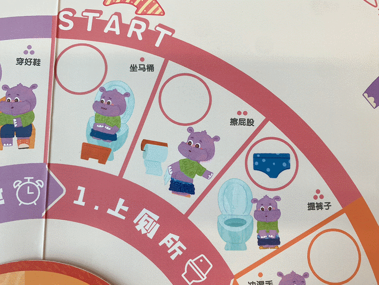 不止如此,小河马桌游还有一张大大的游戏棋盘,上面按幼儿园的入睡程序,分别有上厕所、洗小手、穿拖鞋、脱衣服、铺小床、起床啦,六个自理能力区。