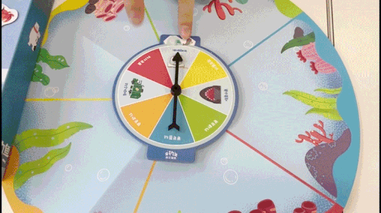 比如白天钓鱼模式:五色棋盘,转到哪里,钓出颜色一致的小鱼。一共20张海洋动物卡,背面是小鱼的习性特点,边钓鱼,边认知不同的海洋生物,拓展知识~