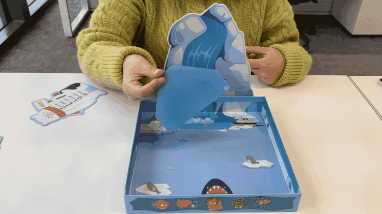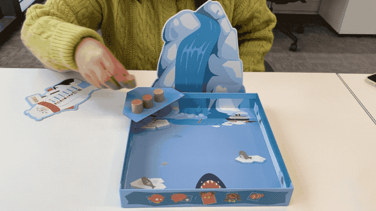 开始游戏前,需要先动动小手,帮北极熊把钓鱼台搭起来。游戏盒既能收纳,也是道具,设计的非常巧妙~