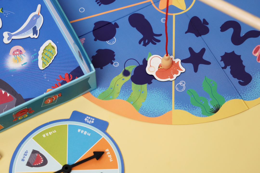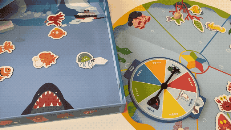 如果转到鲨鱼,就要把钓来的小鱼送到鲨鱼嘴里。孩子可以了解大自然中生物链的存在。