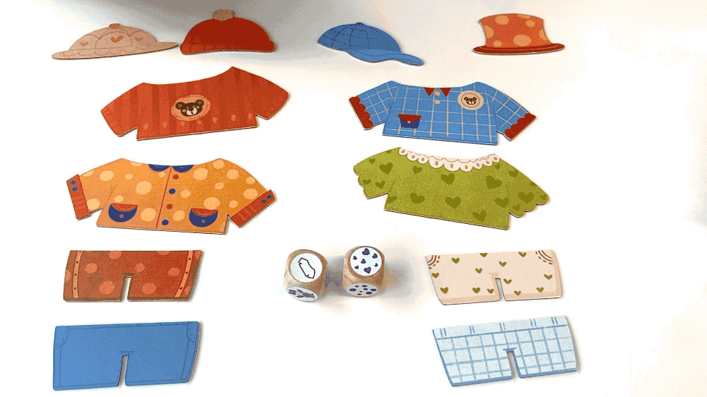 除了4种职业装,还有不同花纹、图案的上衣、裤子和鞋帽。通过扔骰子,爸爸妈妈可以教宝宝认识骰子上的图案,开动小脑筋,找到对应的衣服和鞋帽,帮小河马穿衣服。