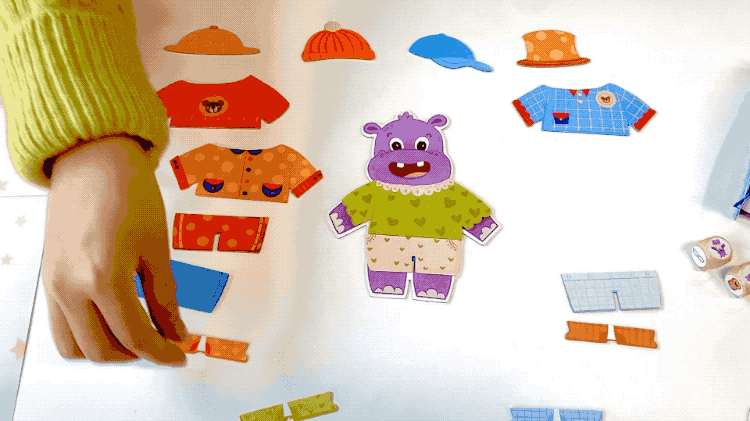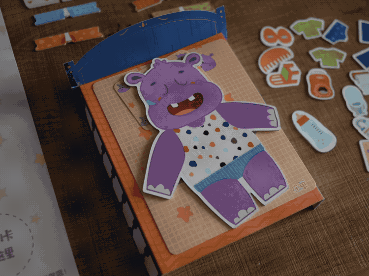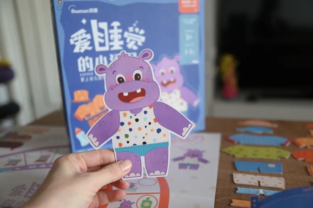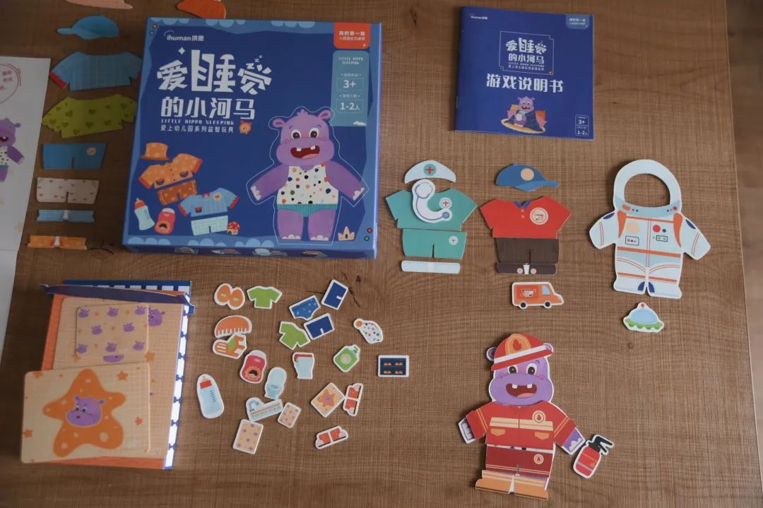 比如那个爱睡觉的小河马,我家3岁女宝最喜欢的就是把衣服分类,我以为就这样了吧,她吆喝:卖衣服啦!卖衣服啦!真的,小朋友总是有办法用自己的方式享受到游戏的快乐。所以爸爸妈妈也不必一定按照说明书的玩法来。享受孩子的创造,是不是更有趣?