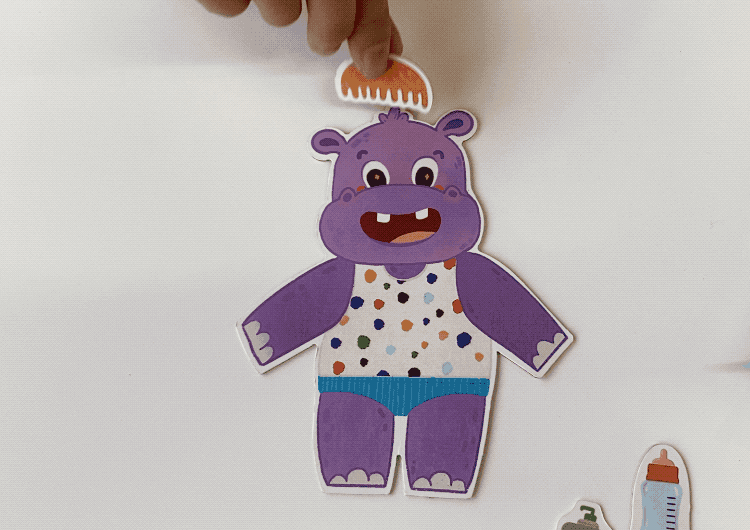 比如洗小手,宝贝需要在道具卡中找到洗手泡沫、小毛巾,还可以给小河马梳头发~