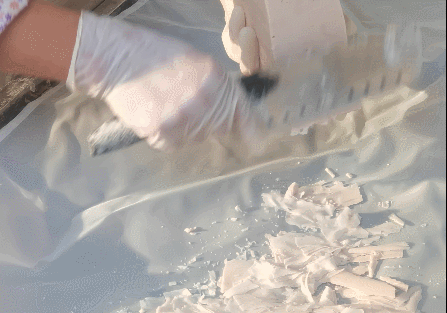 从挑选莲藕到手削制作,每一步都“讲究”的很,片状的藕粉薄厚均匀,晶莹粉嫩,正是好藕粉的象征。