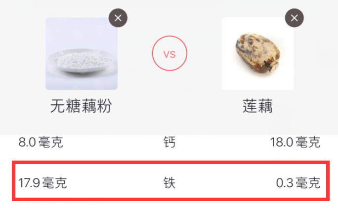 更值得一提的是:莲藕做成藕粉后存储更方便,同时保留了藕粉中的铁元素,每100克铁元素含量高达17.9mg/100g!
