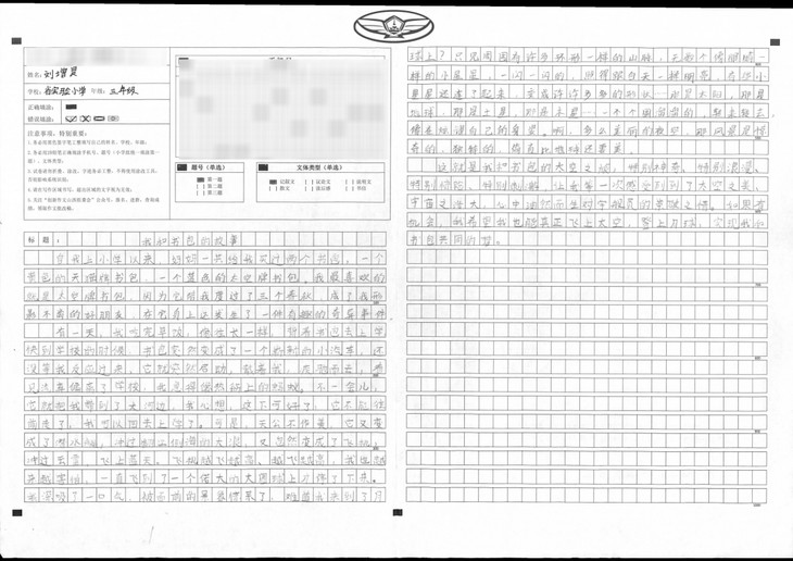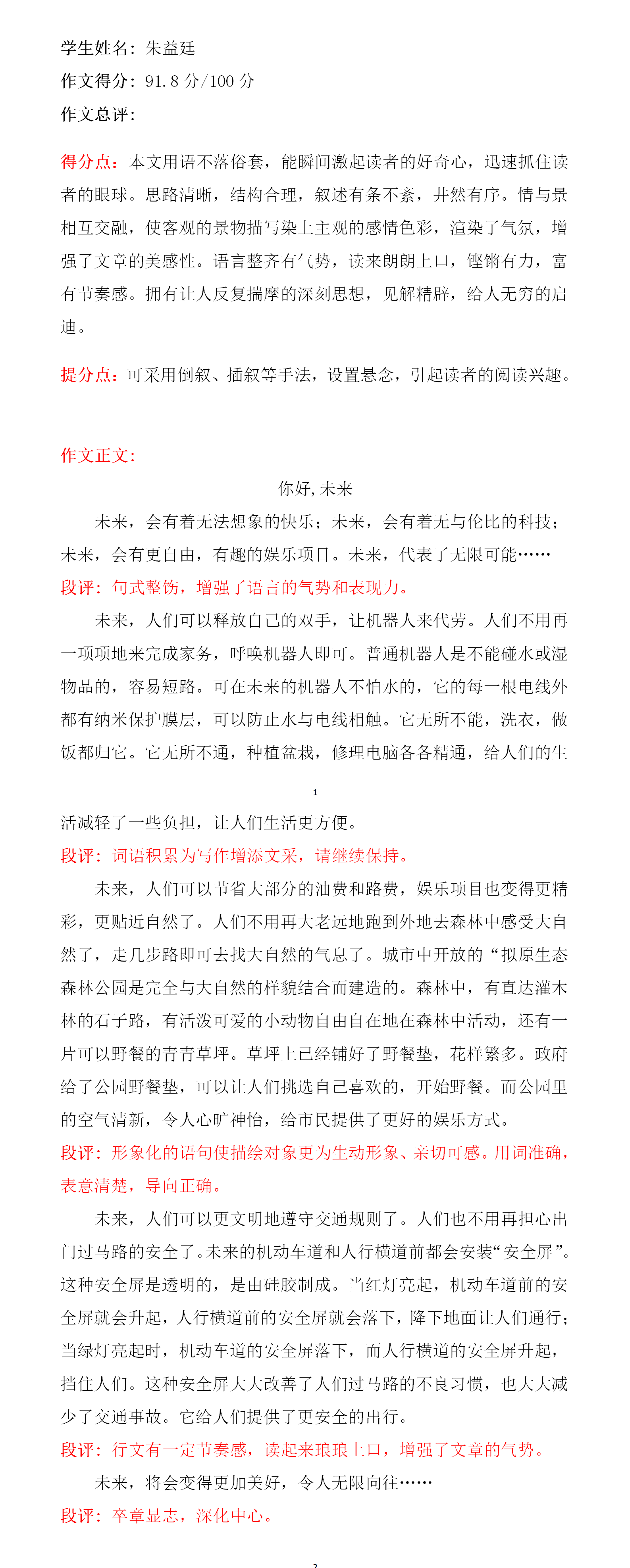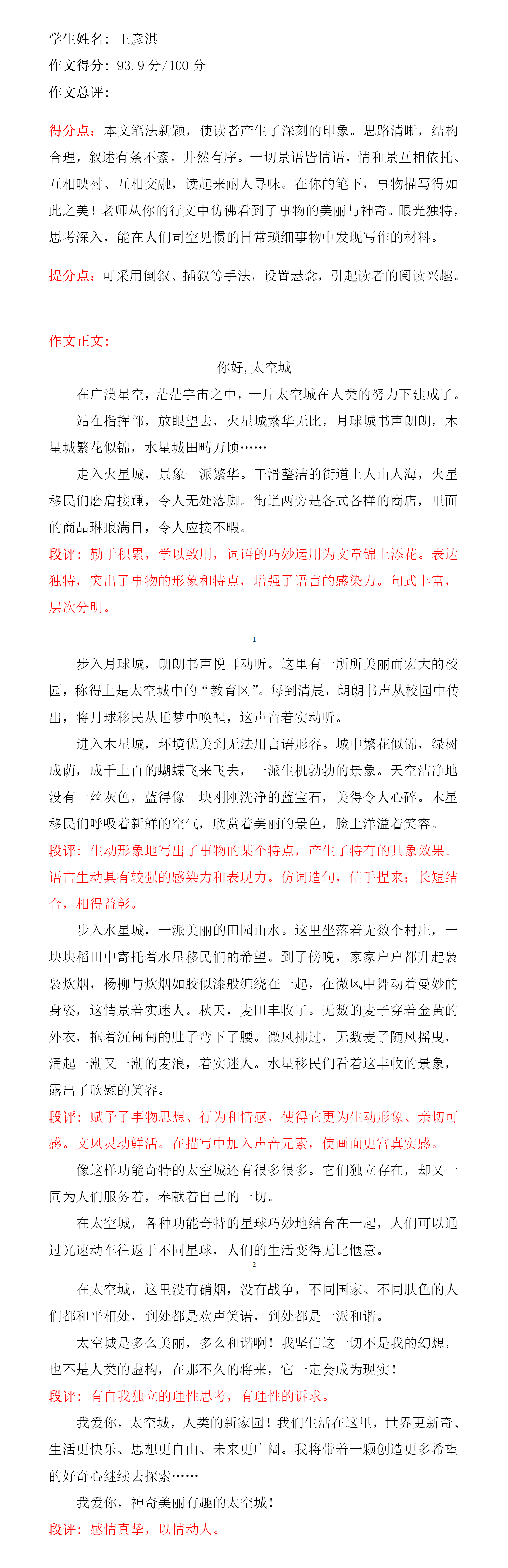整篇文章字迹工整,行文流畅,构思新颖,如此丰富的想象,离不开你平时读书的积累。老师希望你能一如既往地喜欢读书,在书海里多思考,多挖掘,真正做到“读书破万卷,下笔如有神”!