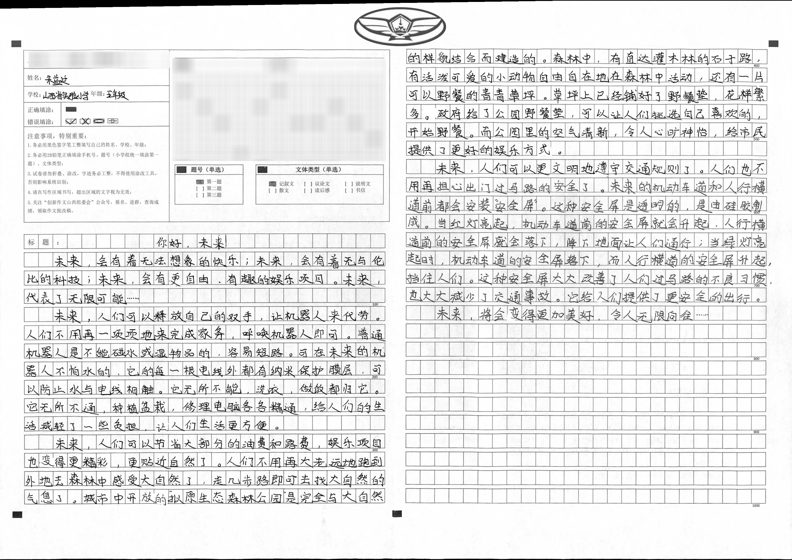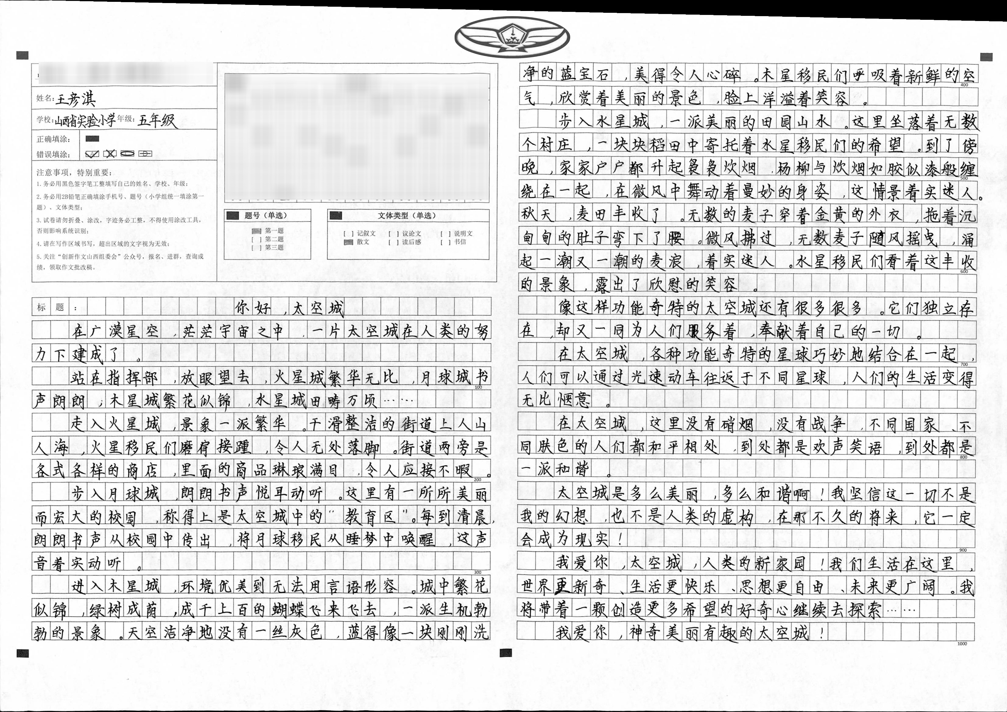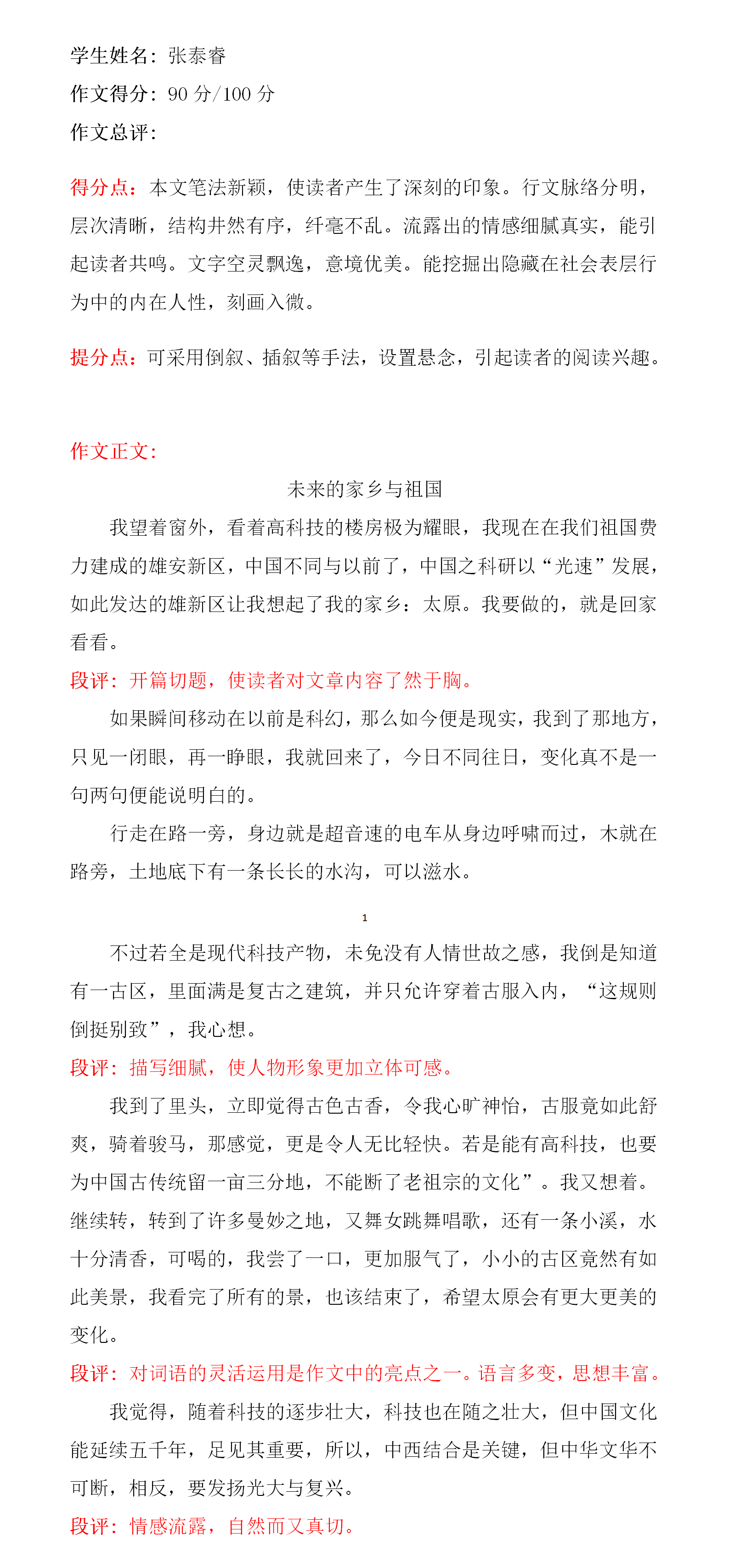 整篇文章字迹工整,行文流畅,构思新颖,如此丰富的想象,离不开你平时读书的积累。老师希望你能一如既往地喜欢读书,在书海里多思考,多挖掘,真正做到“读书破万卷,下笔如有神”!