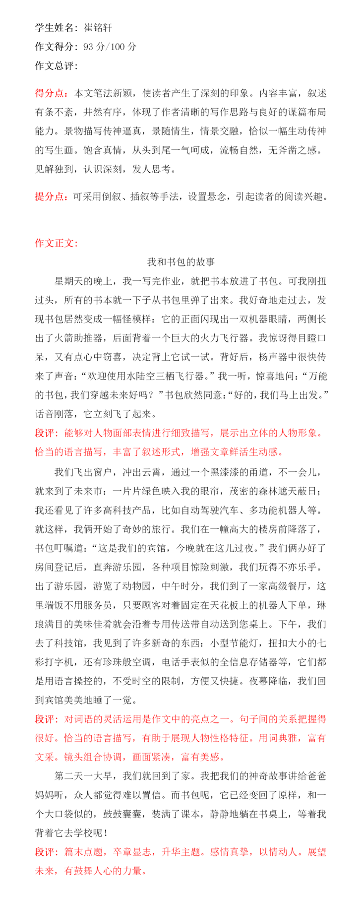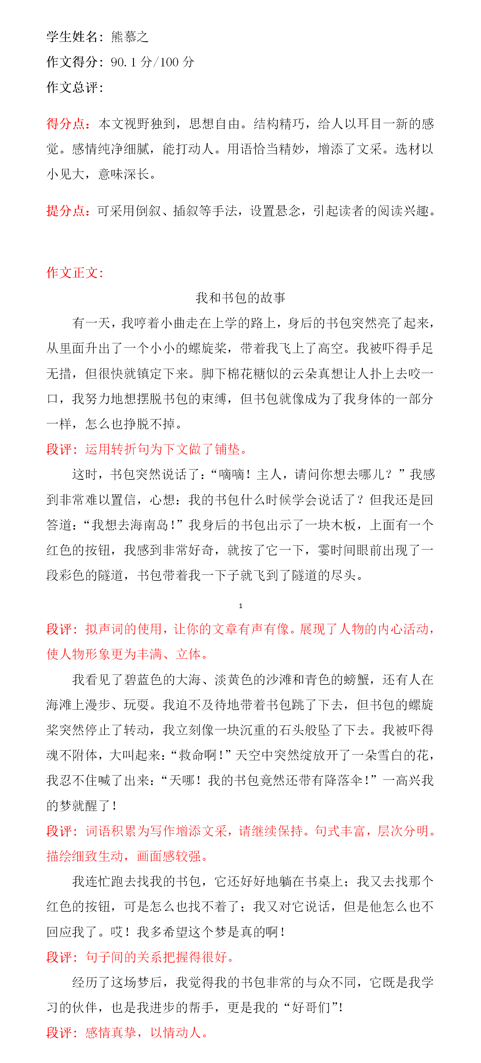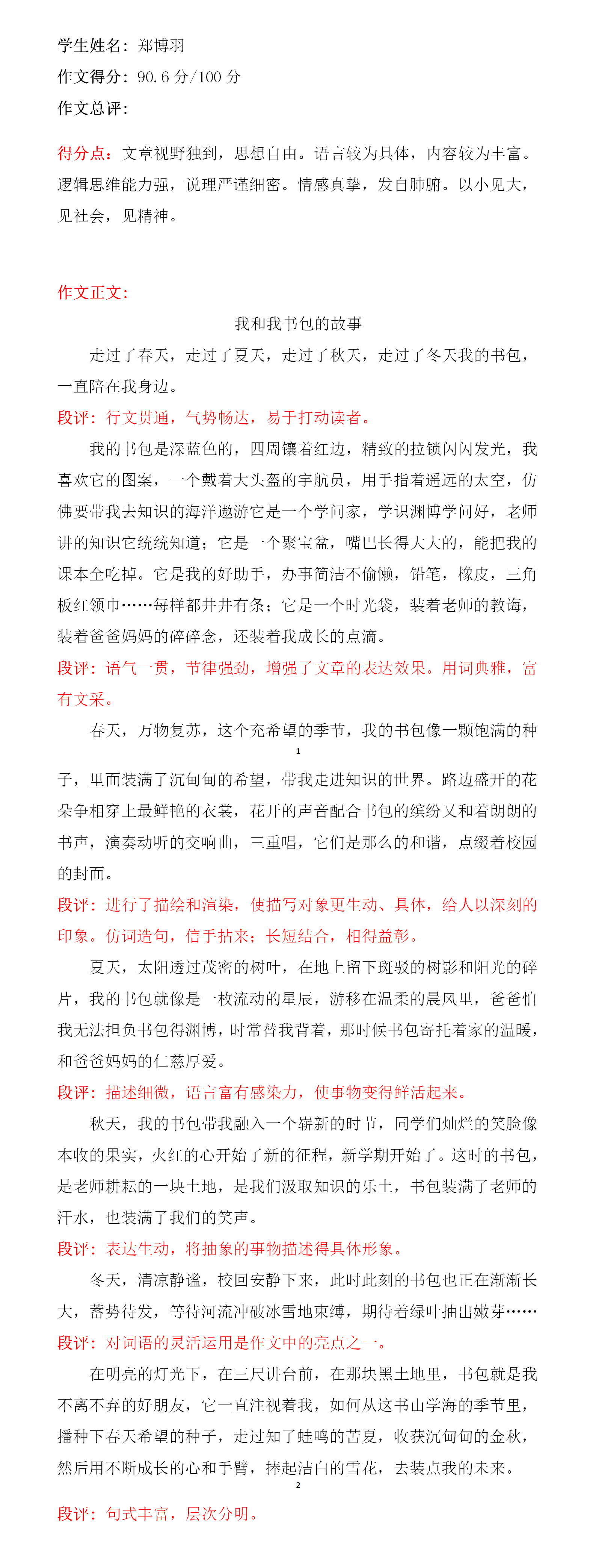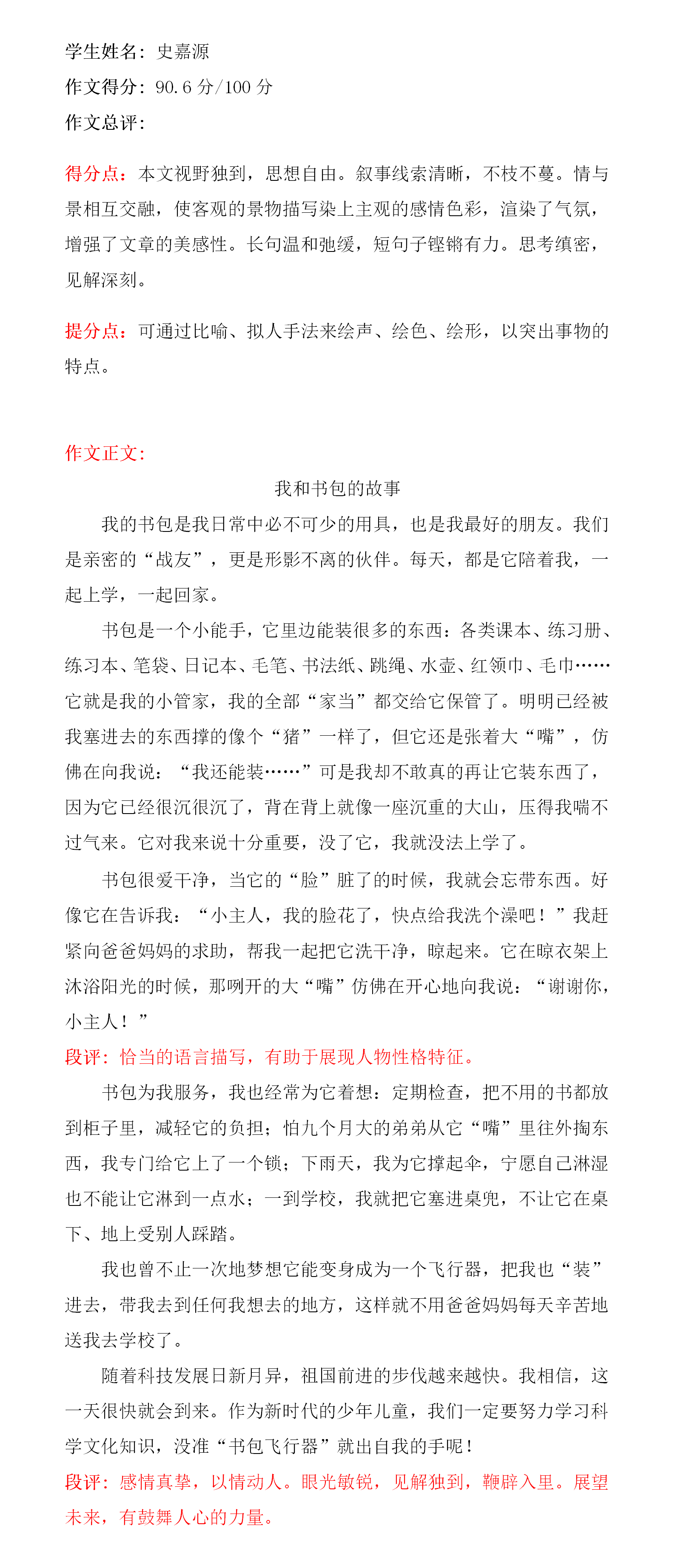 孩子把书包当作朋友,在写作中抒发了对书包的喜爱之情。同时,也让我们看到了他和书包之间真挚的“友情”。以生活为写作源泉,在生活中捕捉有声有色的画面,利用有声有色的语言,抒写有声有色的体验,再现出有声有色的生活。加油吧,少年!