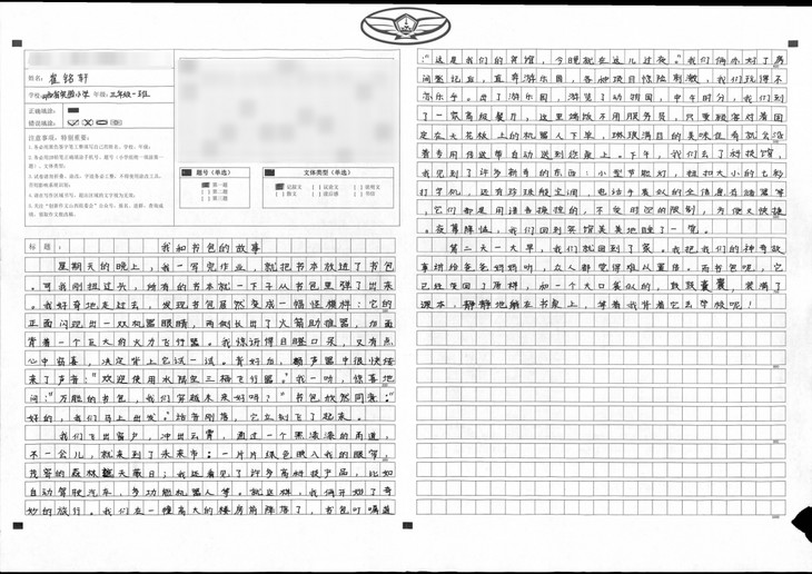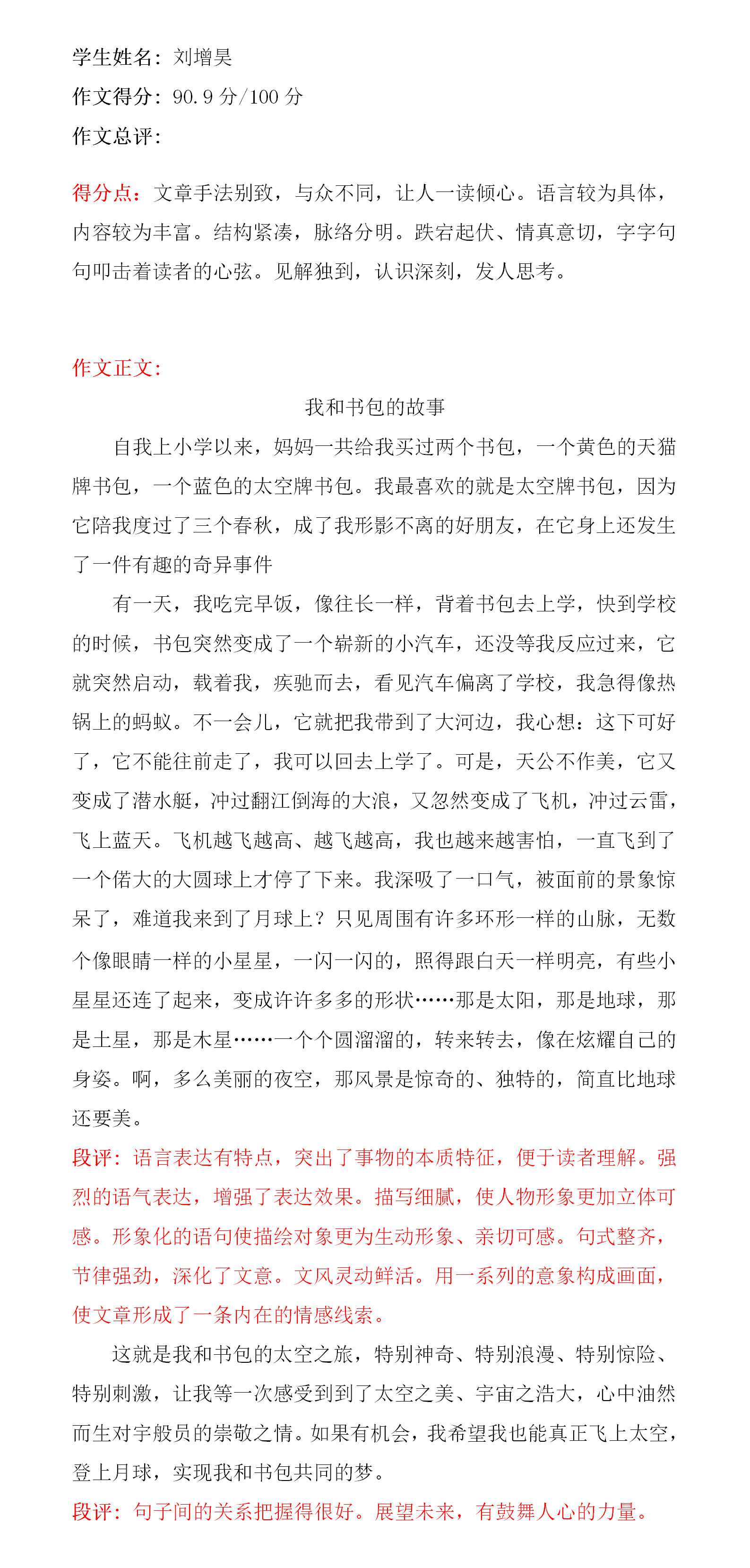 看似天马行空、荒诞不羁,实则合情合理、生动而又不失童趣。文章构思巧妙,语言灵动,想象奇特,匠心独运,看得出小作者对浪漫天空的好奇之心、对航天事业的热爱之情。小作者将日日相伴的“书包”演绎成一个个神奇的“运输”工具,是新时代少年童真童趣的真实反映,这与平日里小作者坚持听新闻联播、广阅航天知识的习惯密不可分,与小作者崇尚科学、自由浪漫的丰富想象力密不可分。