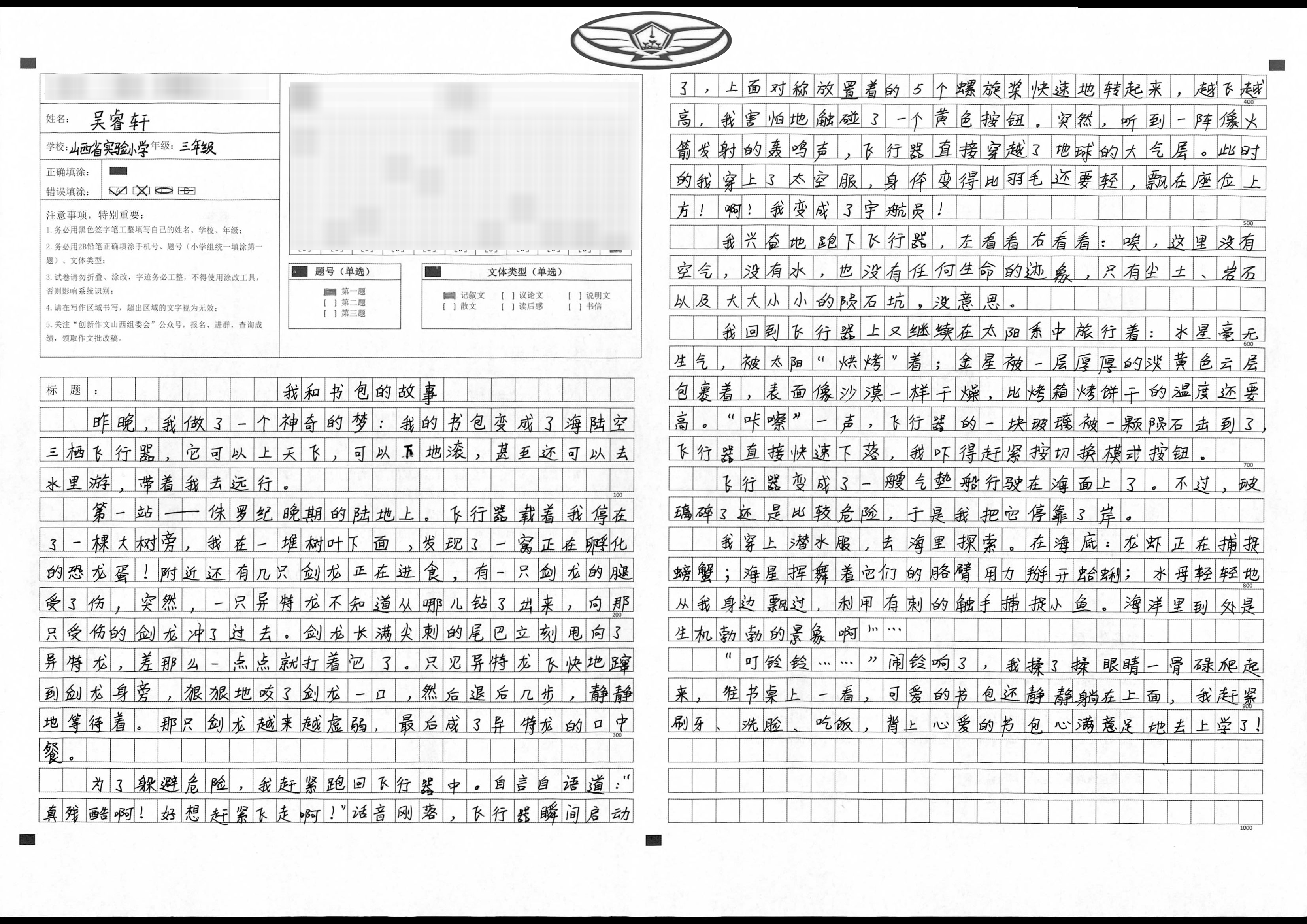 当看到这个征文题目和写作要求时,我被“三栖飞行器”这几个字眼深深地吸引了,我的愿望就是能够拥有一个这么神奇的书包,带我真正体验一下我从书里看到的世界,因此,我把自己内心最真切的情感写出来了。