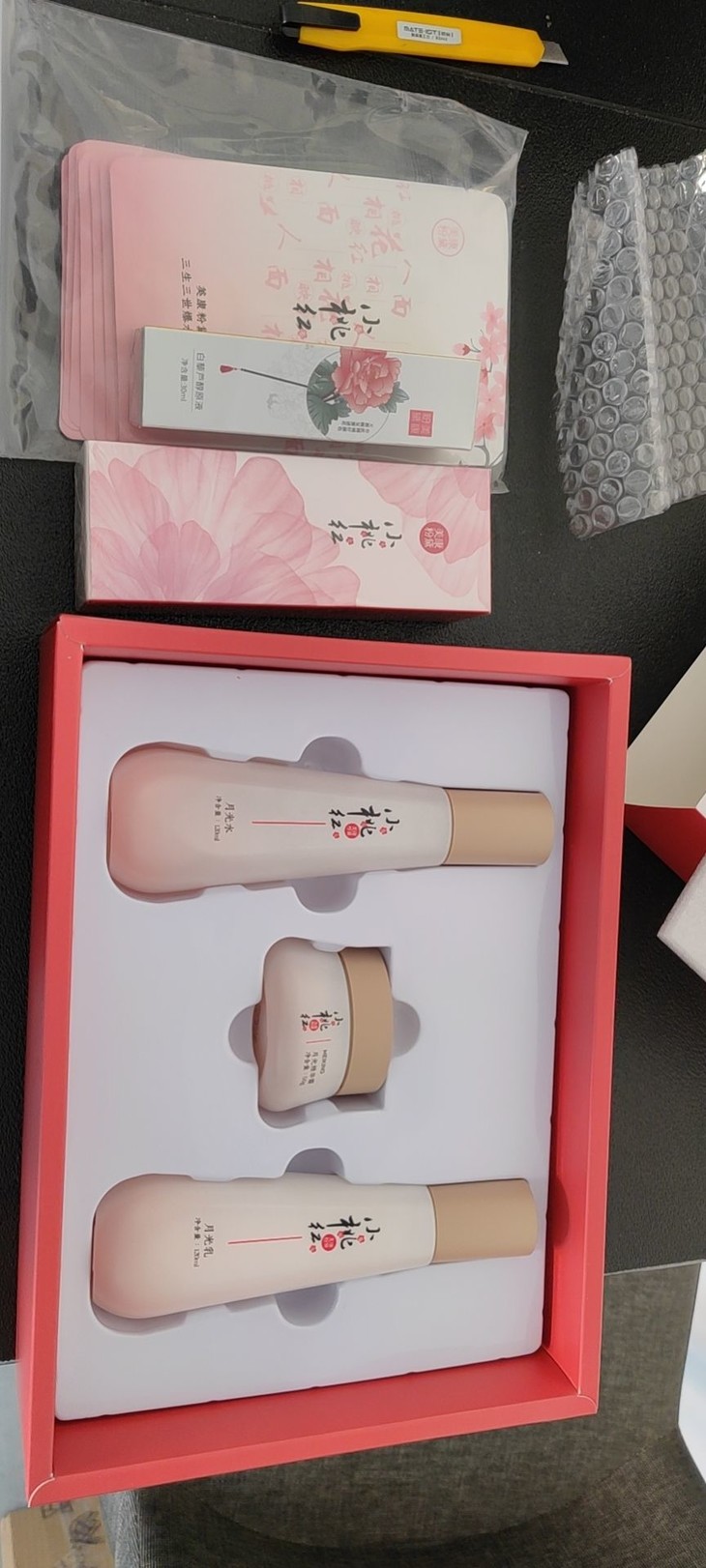 前后买了两套了,自己一套嫂子一套,这个颜值是真的吸引人,粉粉嫩嫩看着就心情好,两套都是趁搞活动价格便宜买的,简直不要太实惠,还送洗面奶和白藜芦醇原液,我的那套还送了10片小桃红面膜,反正就超级爱,这是第二次入手你家护肤套装,第一套水杨酸的正在用,我用的慢,用了半年了感觉脸出油少了,不吃辣的话也不长粉刺闭口了,皮肤状态比以前好了很多。之后还会入手别的套装的,深深沉迷于美康的国风颜值!!