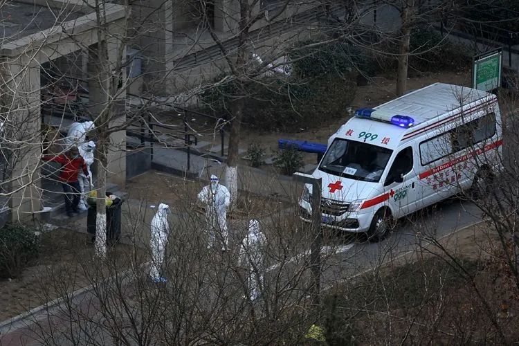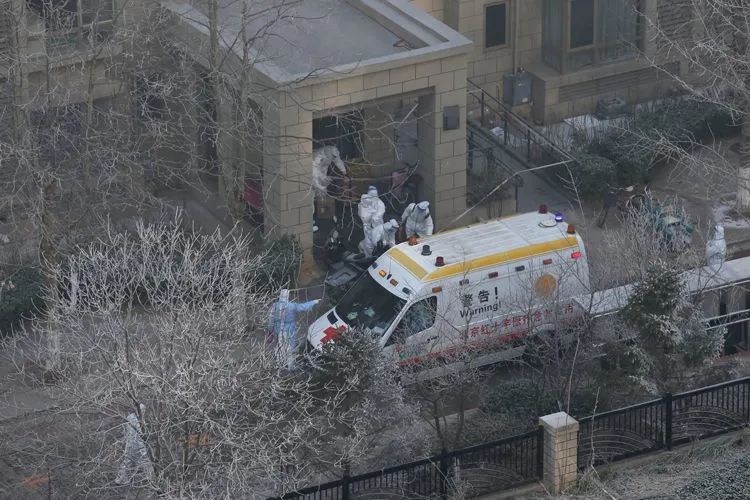 ▲1月26日12时8分,融汇社区某栋楼前,一家人身穿防护服,准备登上救护车。