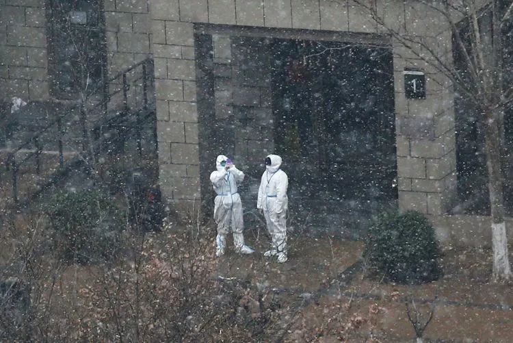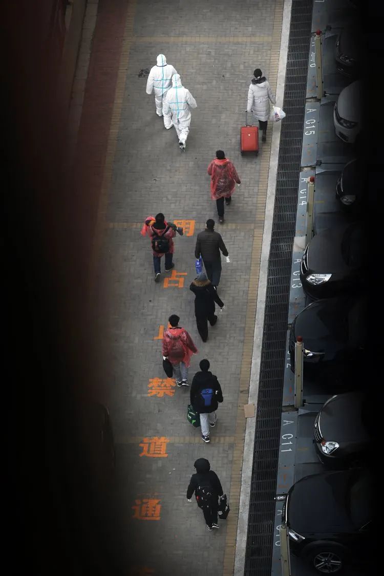 ▲1月21日9时21分,融汇社区北门,身穿防护服的工作人员正组织部分居民准备前去集中隔离点。