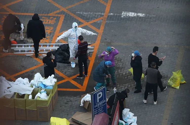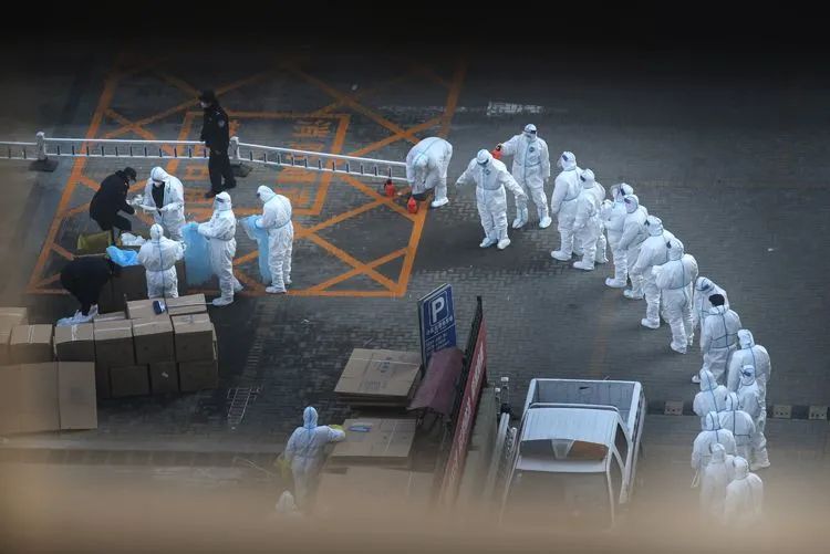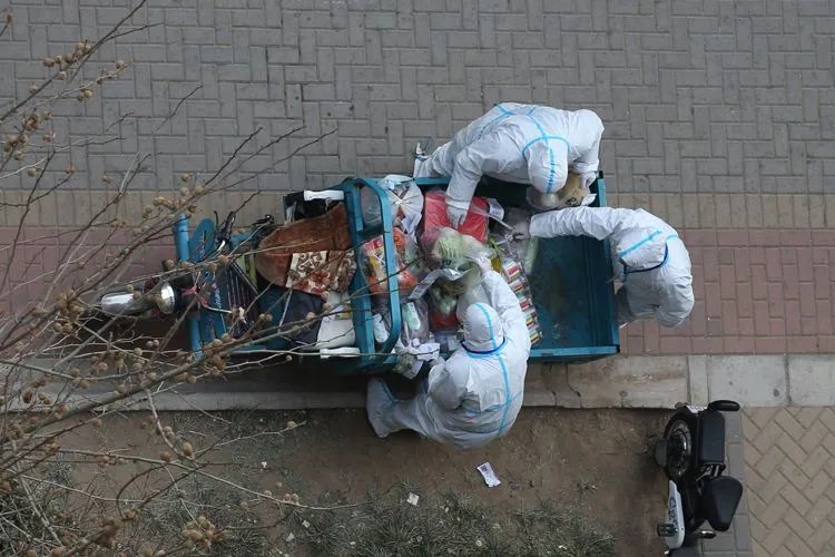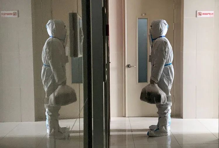 ▲1月24日16时29分,融汇社区,身穿防护服的志愿者给居家观察的群众运送生活物资。