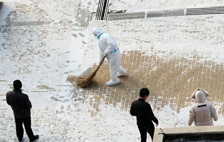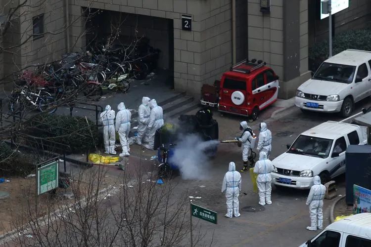 ▲1月24日13时14分,融汇社区北门,保安和医护人员执行任务后全身消毒,脱去防护服。