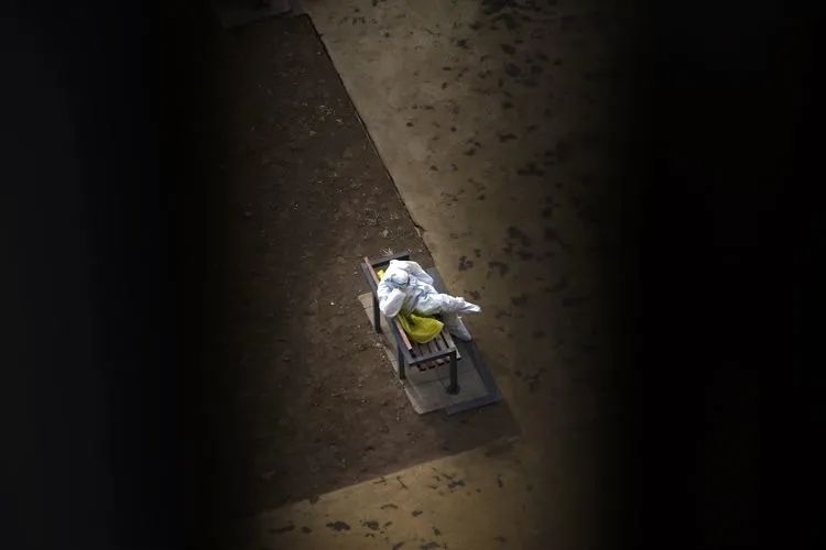 ▲1月27日11时57分,融汇社区,工作人员坐在长椅上休息。