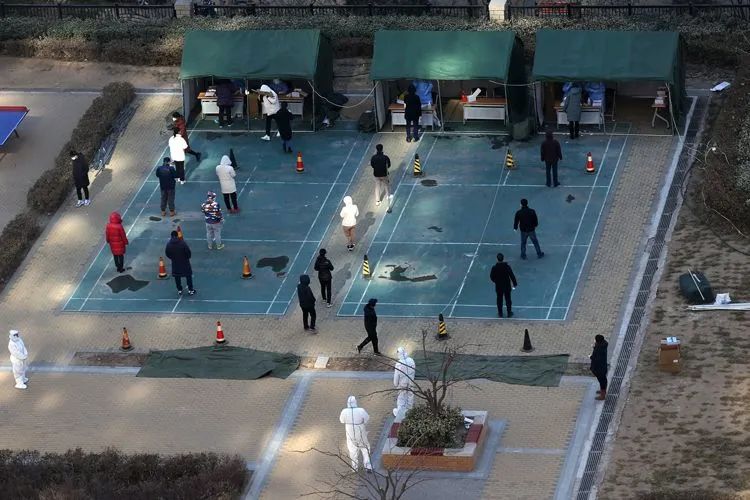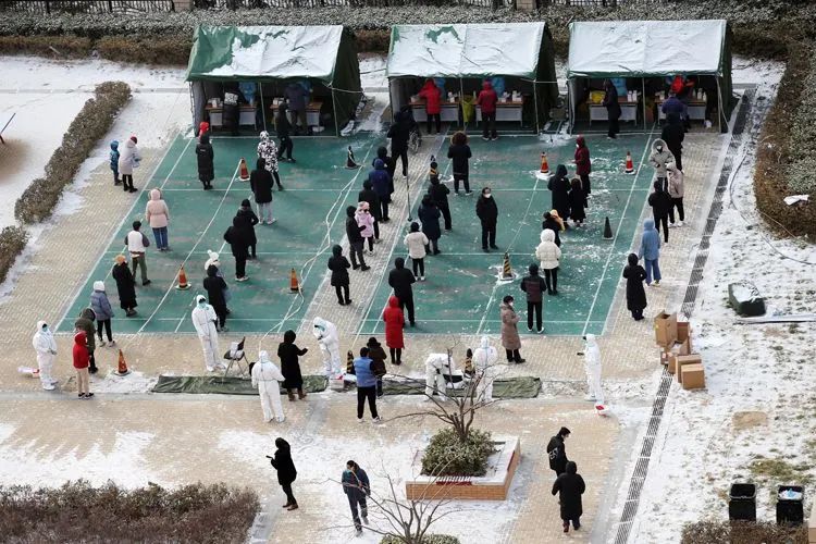 ▲1月29日12时21分,融汇社区,居民们排队进行全员第四次核酸检测。