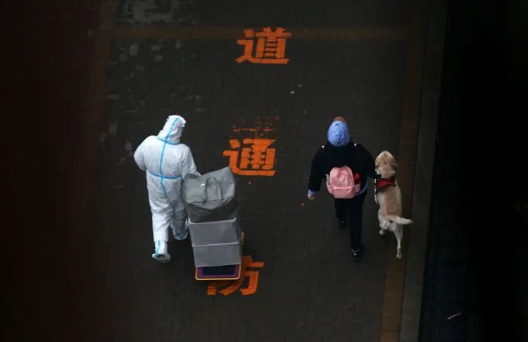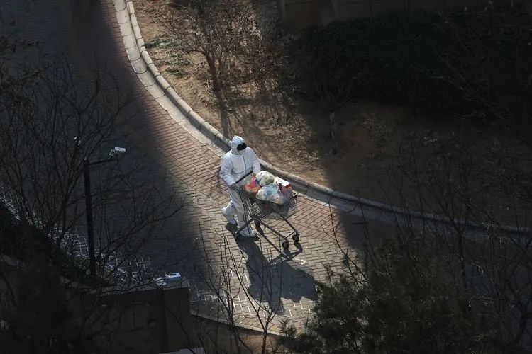 ▲1月20日上午,融汇社区,一名身穿防护服的志愿者推着满载物资的小推车为居民送货。